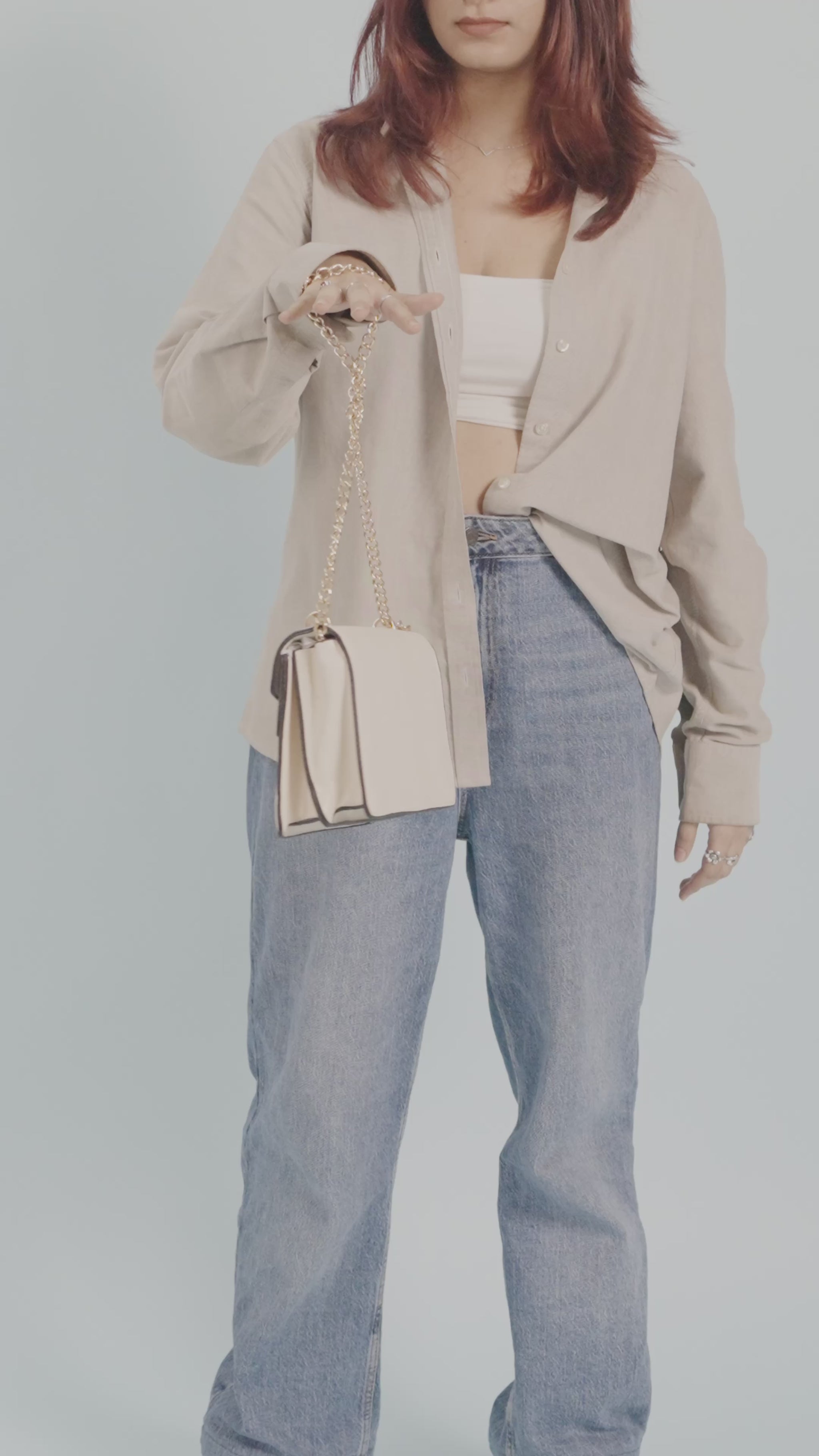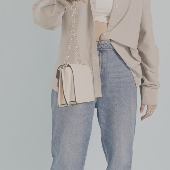 A sophisticated color-block flap bag in off-white/cream with a contrasting dark brown lower panel on the front. It features a prominent gold-tone clasp and is carried by an elegant gold chain sling strap.