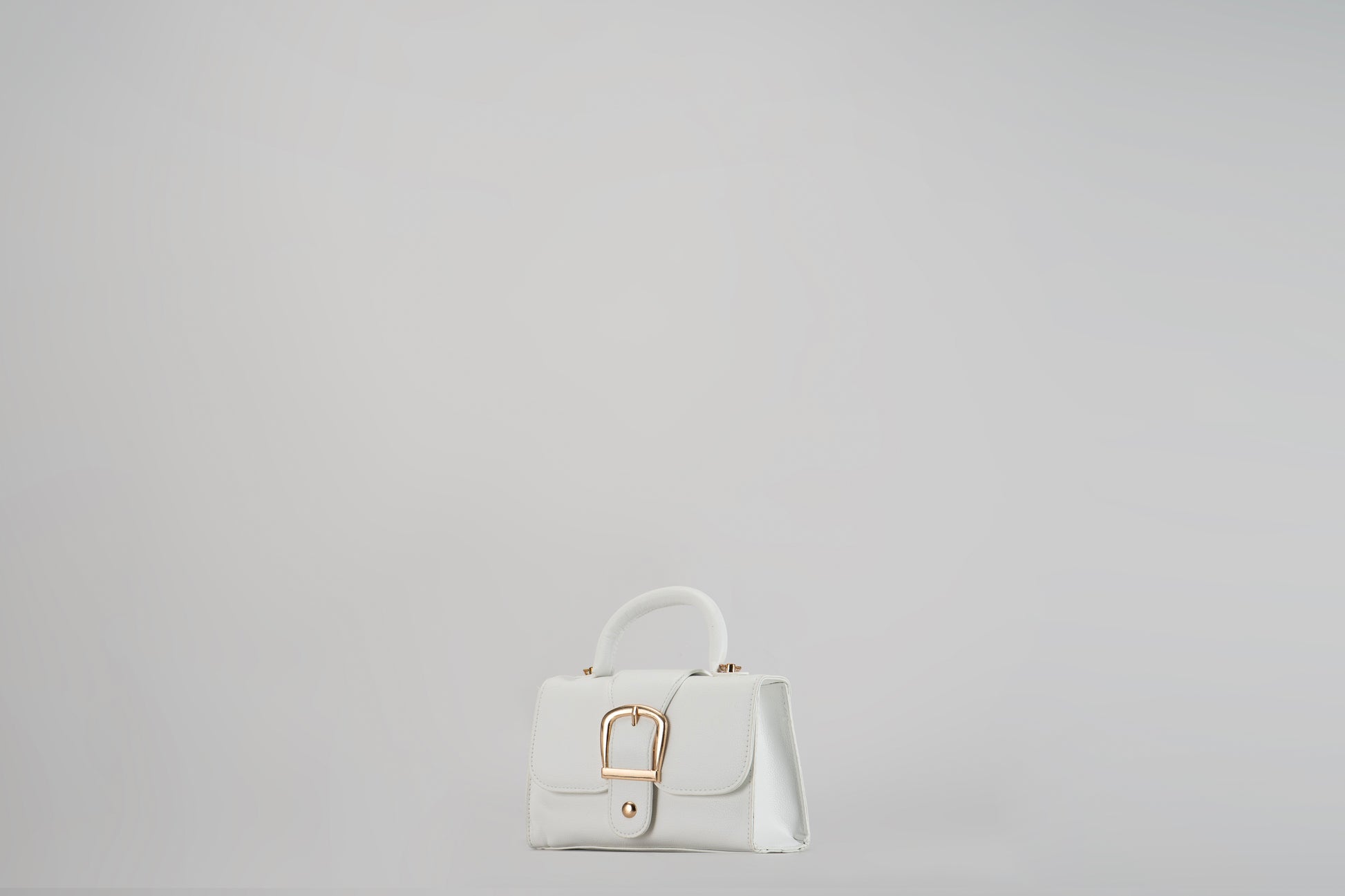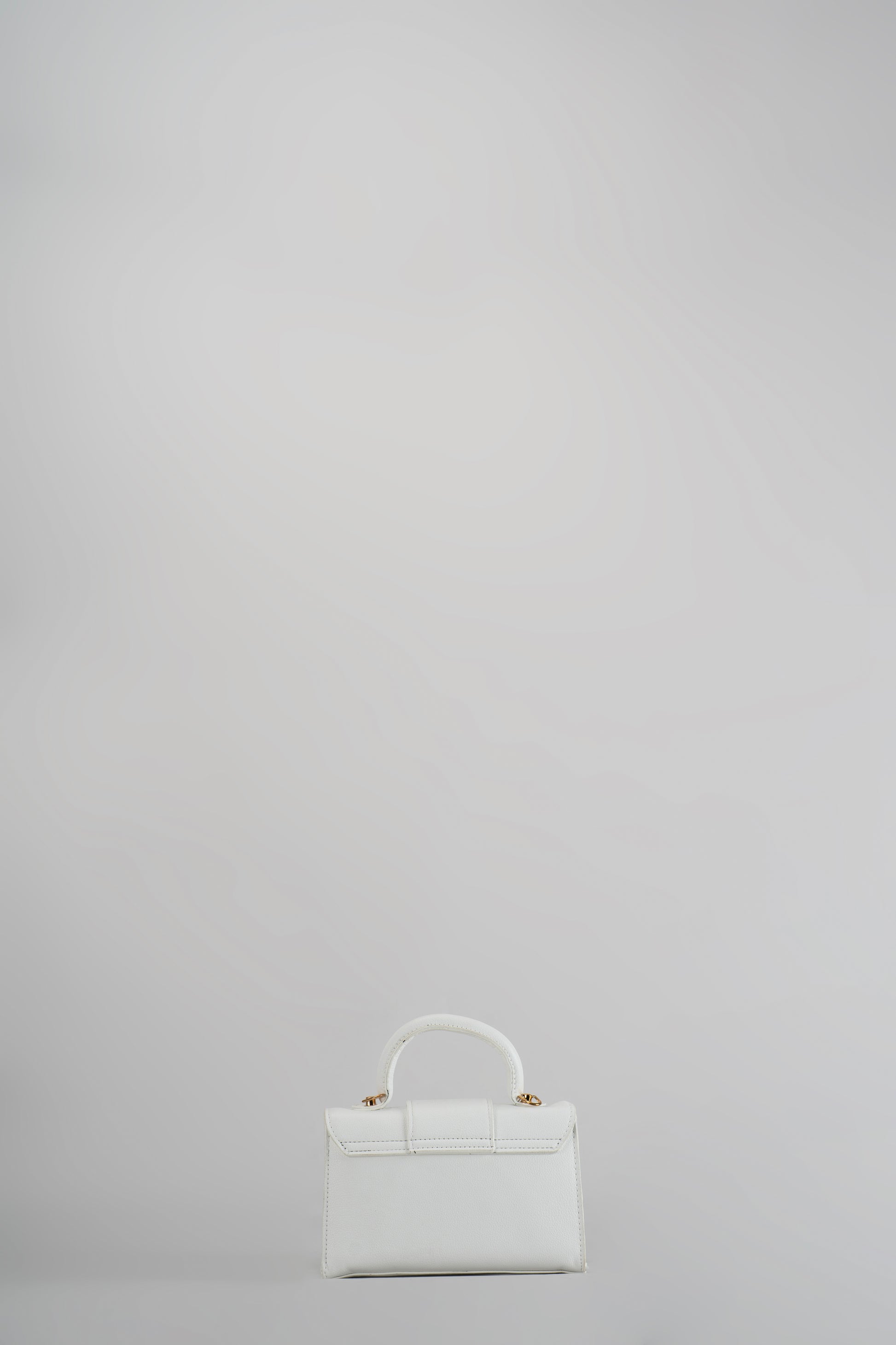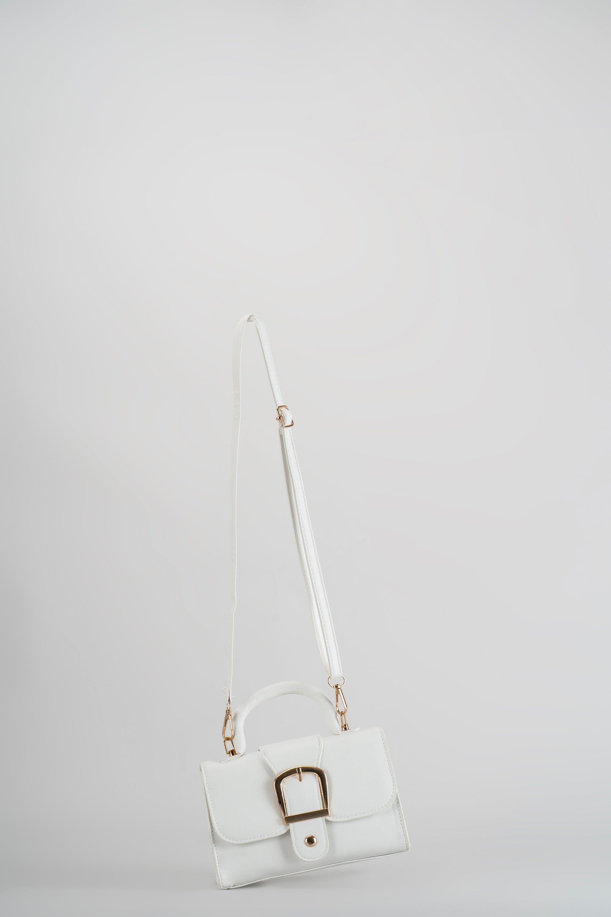 A bright white sling bag with a bold design. It features a wide shoulder strap and a very prominent, large rectangular buckle detail on the front flap.