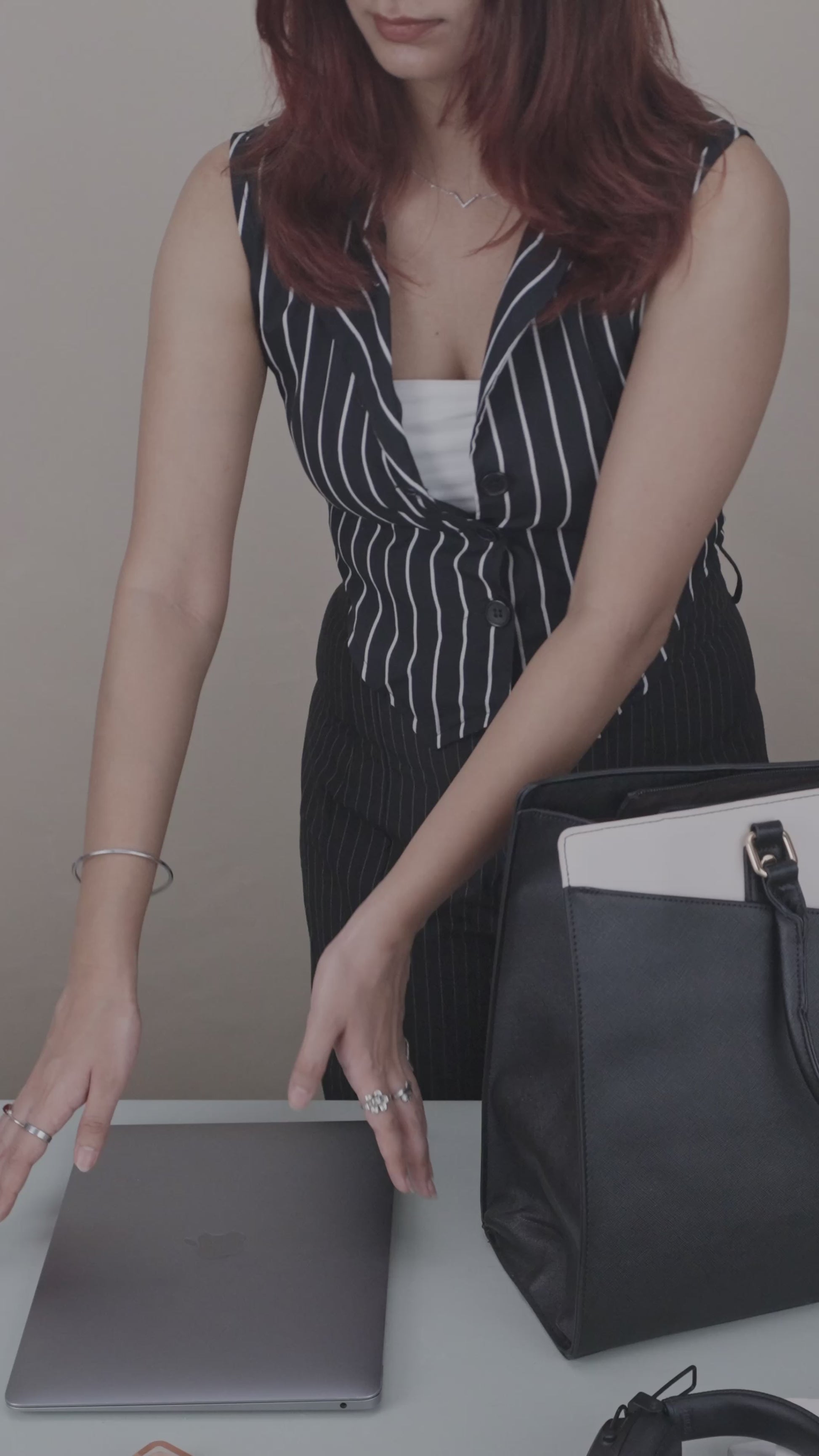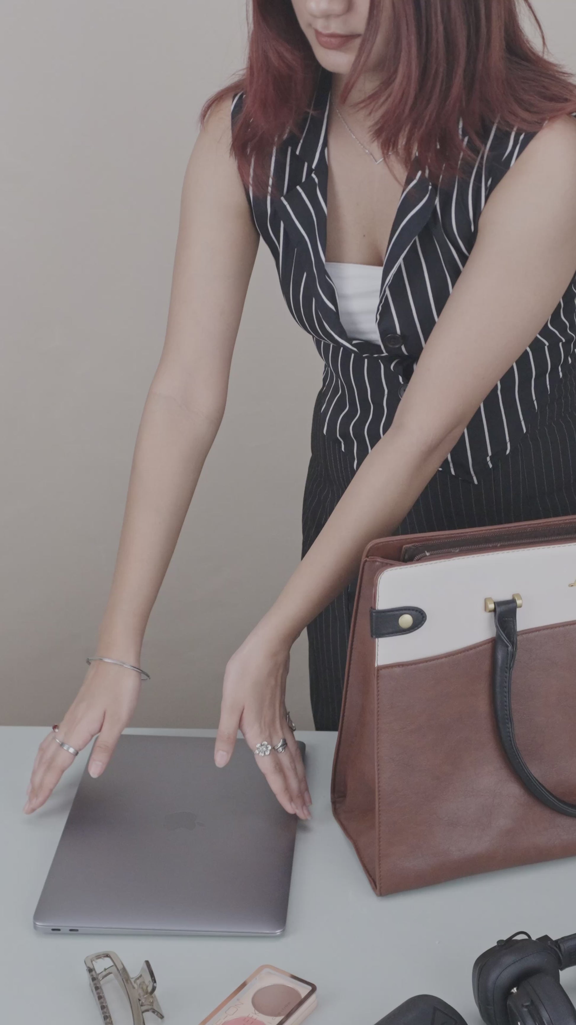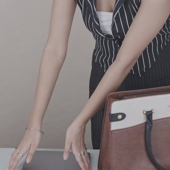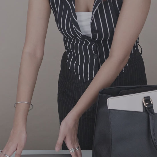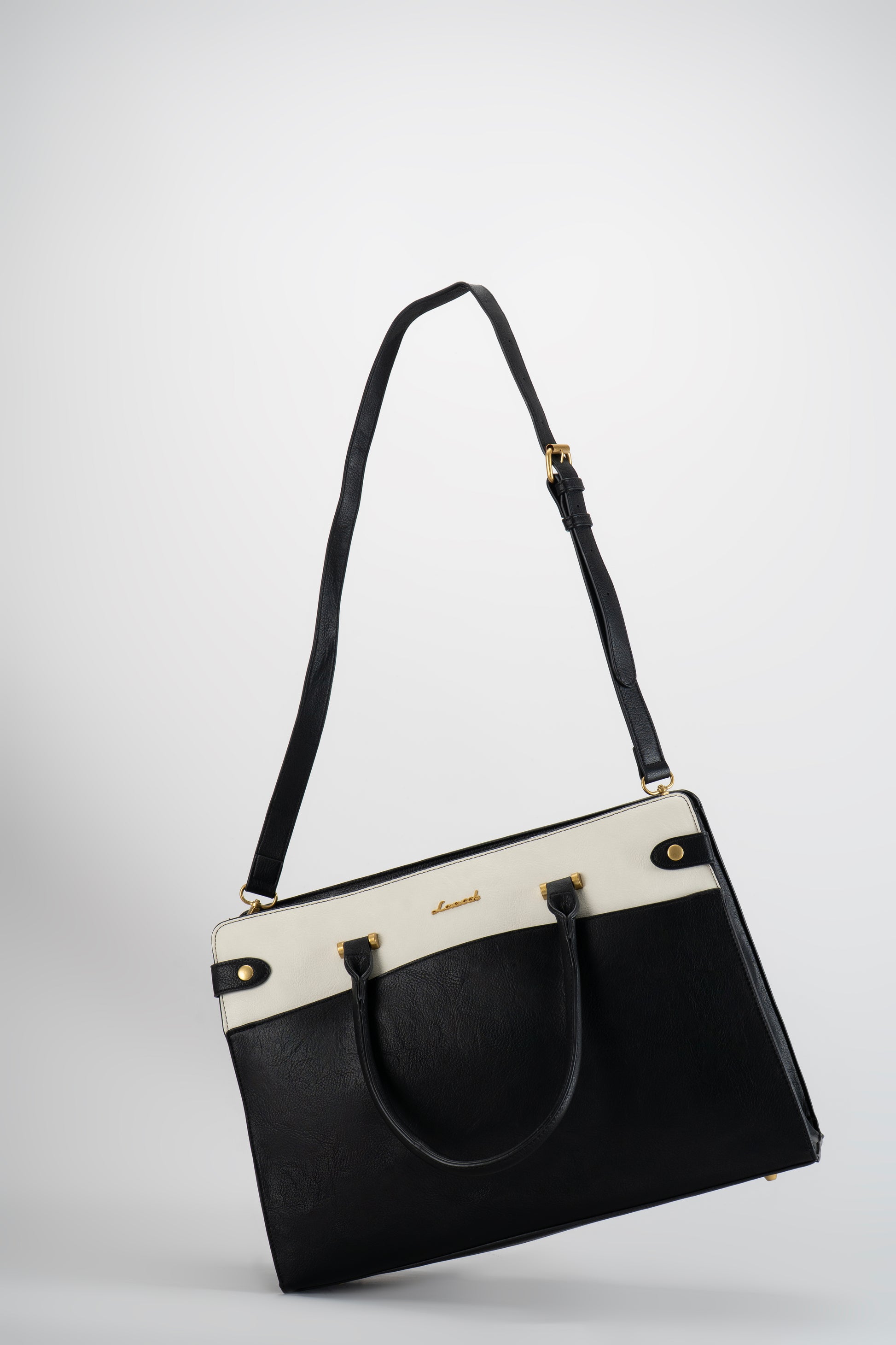 A highly structured color-block tote bag with a strong horizontal division: the main body is black, and the upper trim/band is white. It has two black top handles and a detachable sling strap.