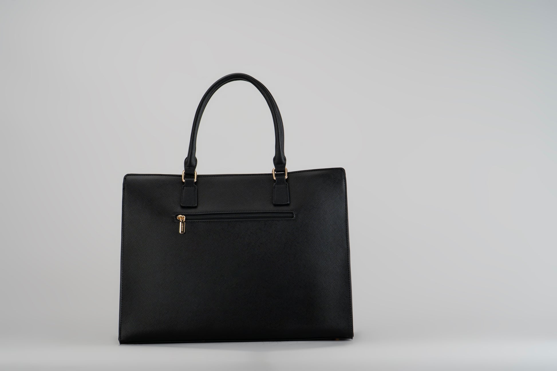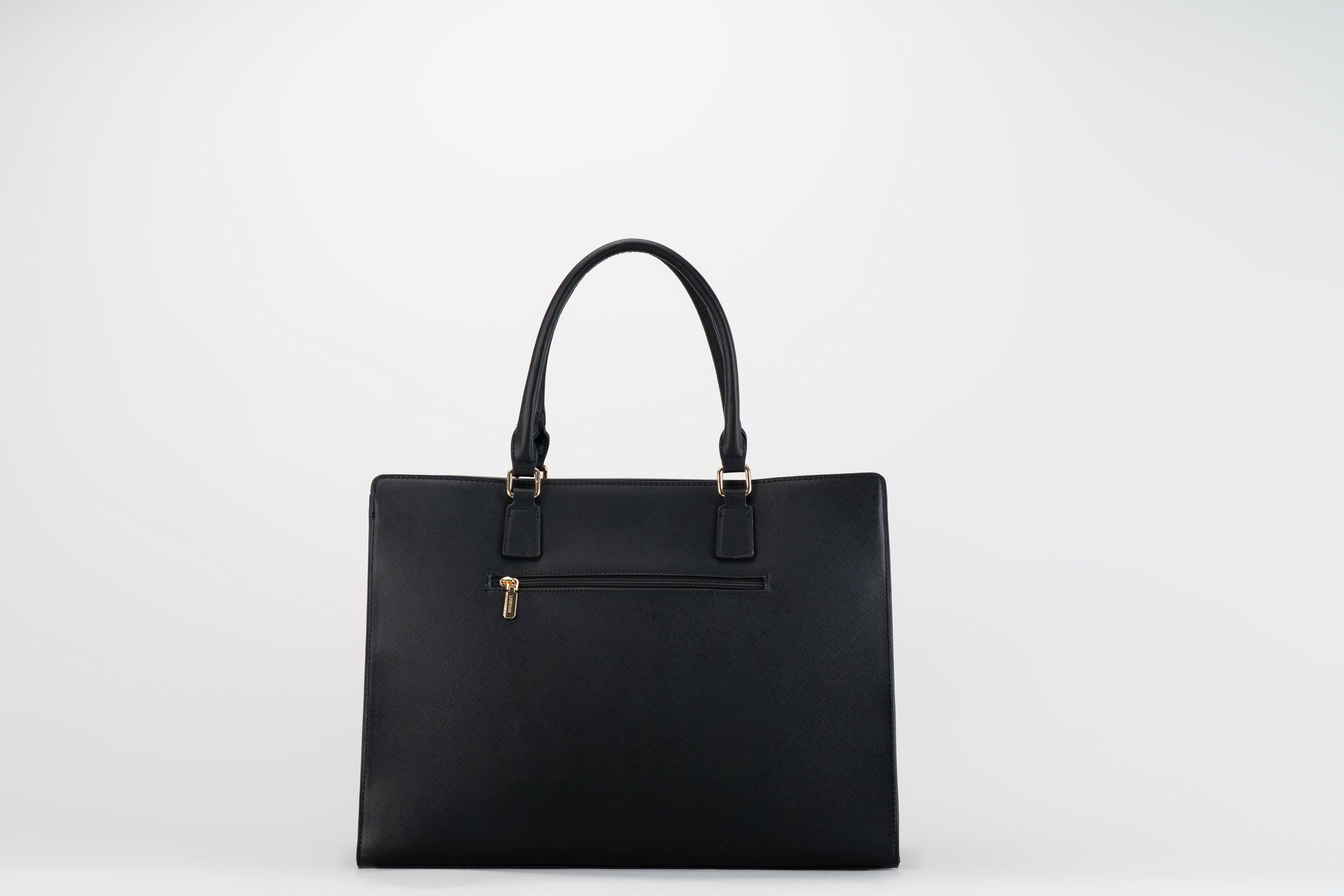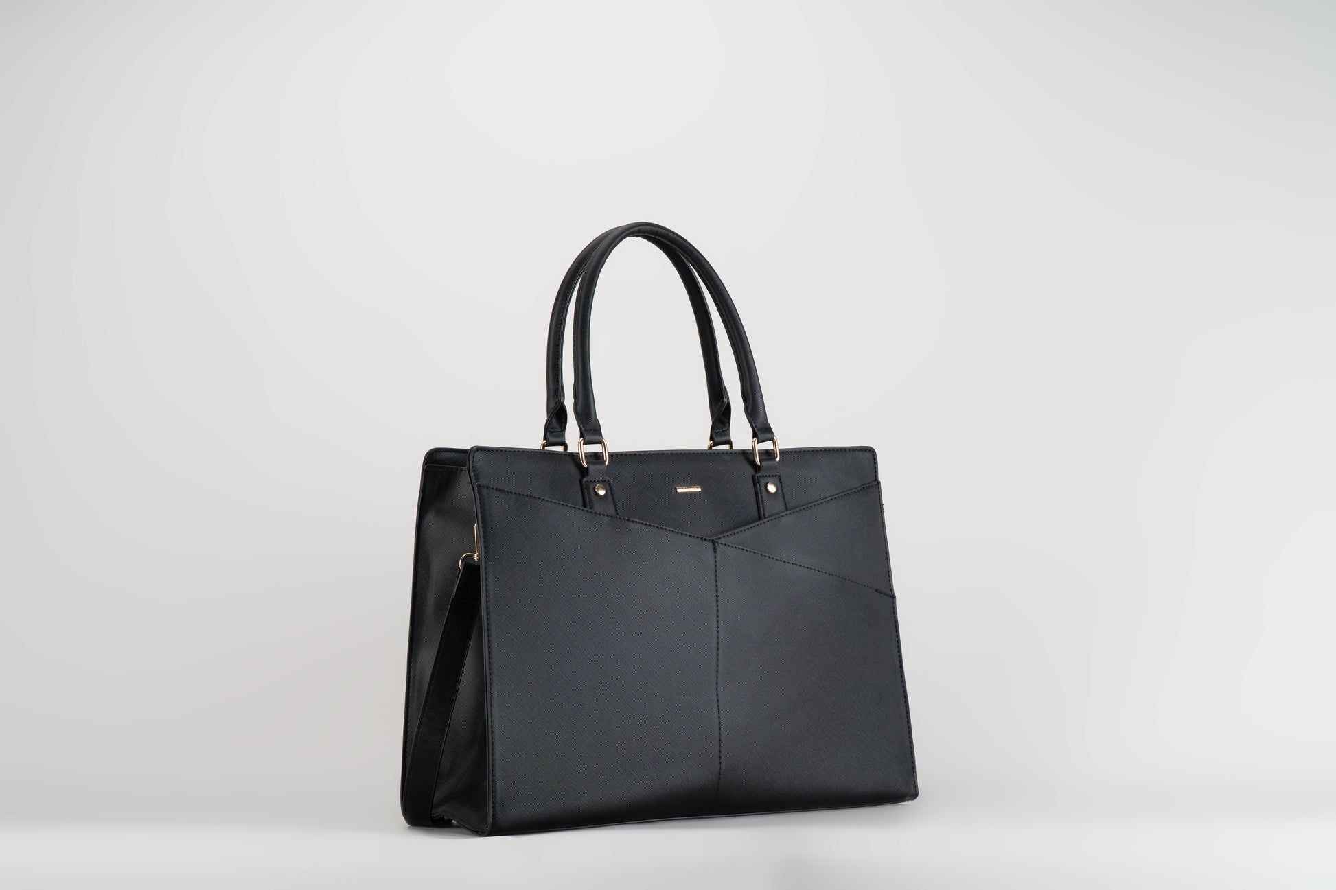 A sophisticated, structured, black tote bag. It has a clean, trapezoidal silhouette with two top handles and a detachable shoulder strap. The smooth body has subtle detailing near the handles.