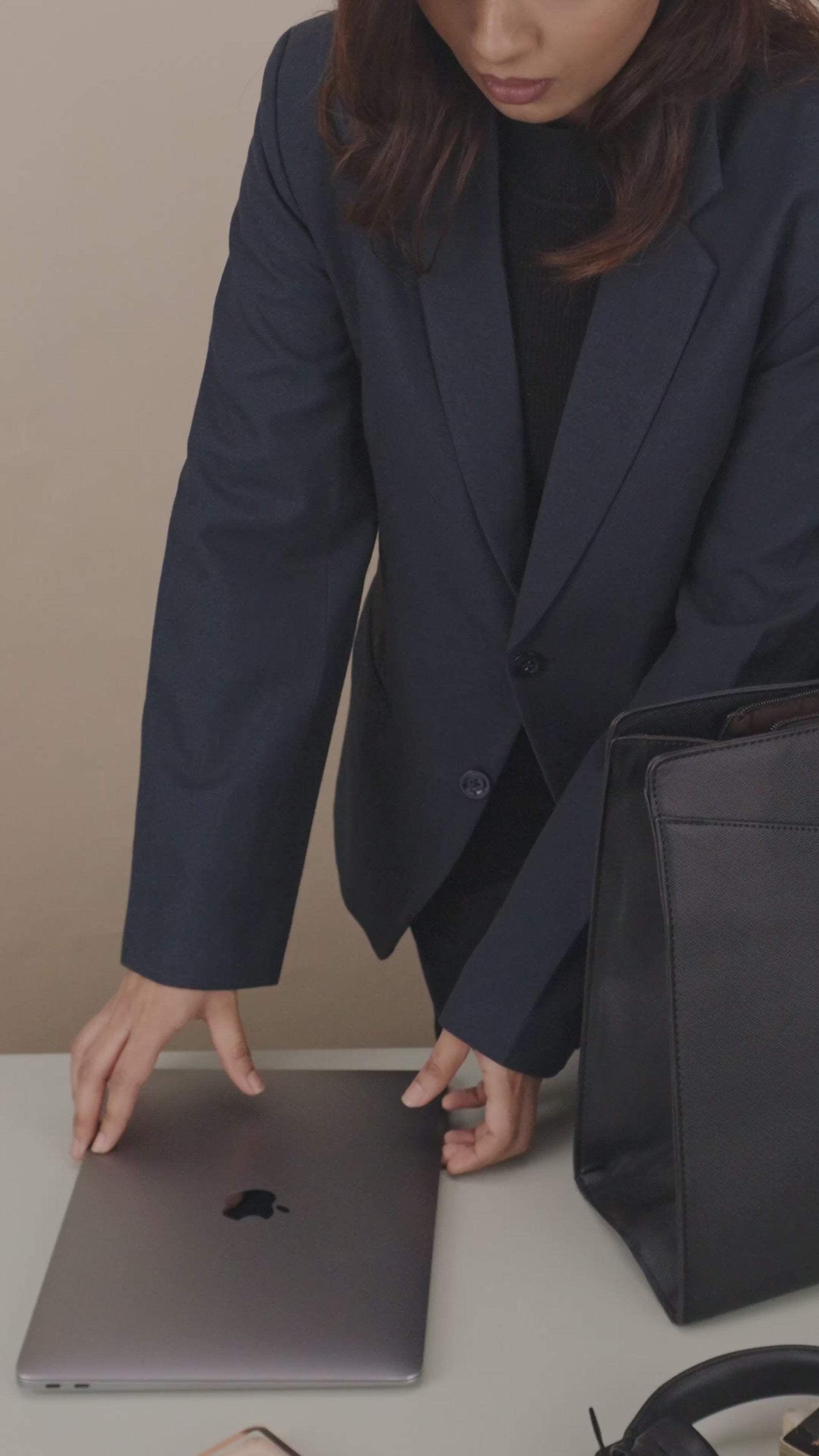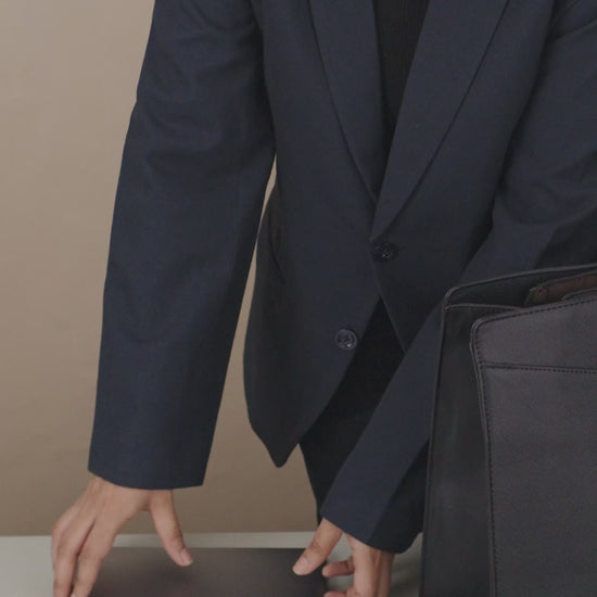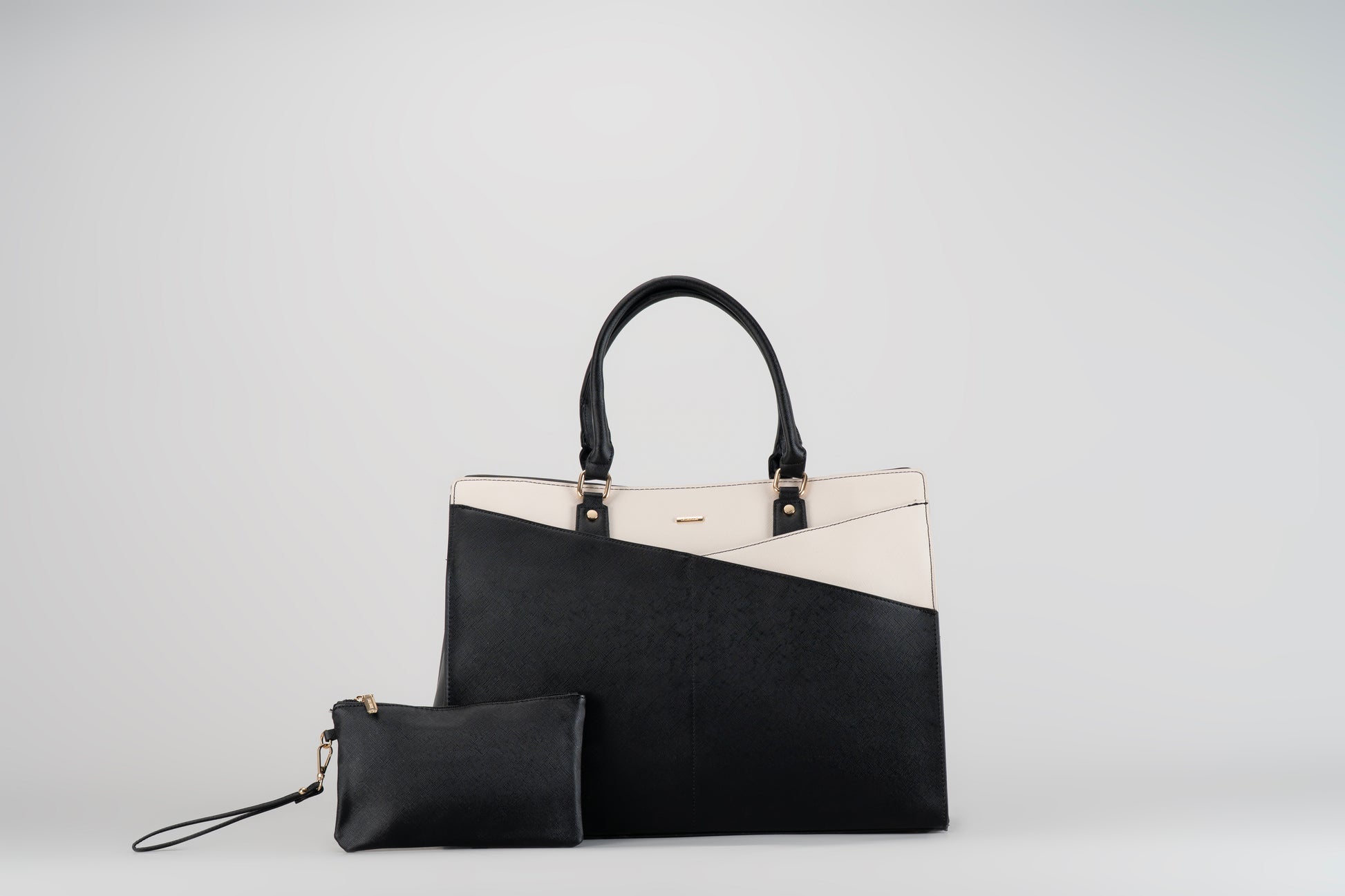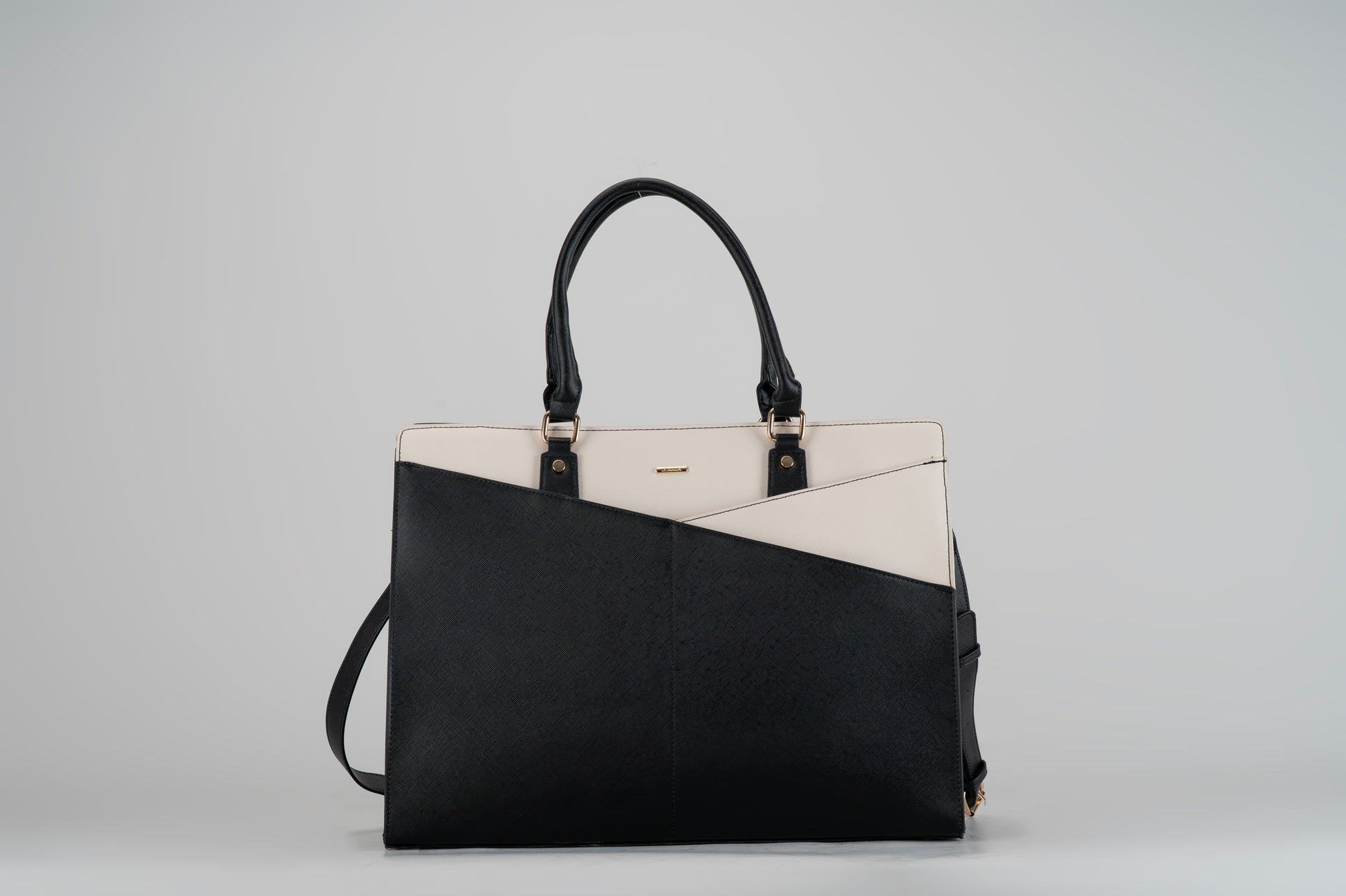 A sophisticated, structured, black tote bag. It has a clean, trapezoidal silhouette with two top handles and a detachable shoulder strap. The smooth body has subtle detailing near the handles.