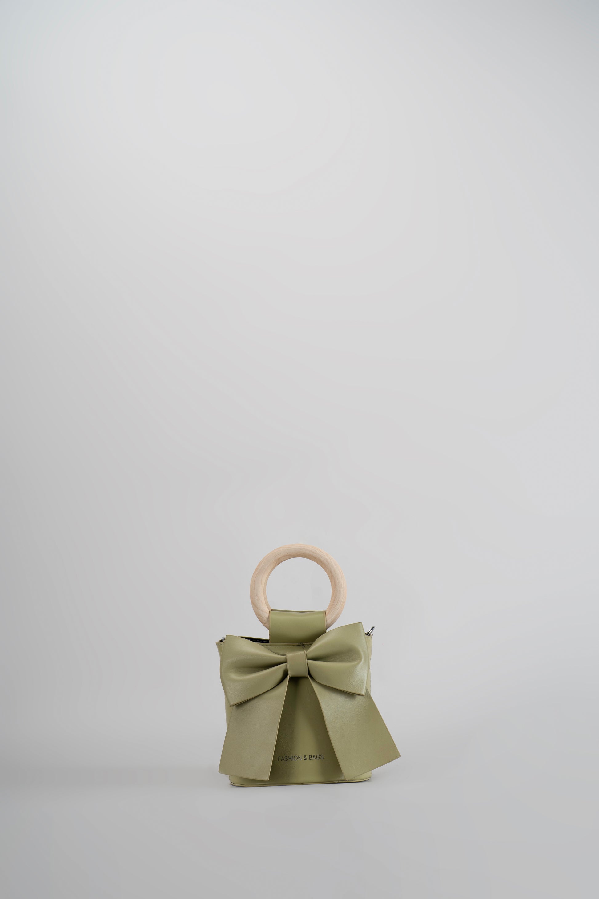A small, structured drawstring bag in a muted olive green color. It has a unique circular wooden ring handle and is finished with a charming, oversized bow detail on the front, providing a rustic, stylish touch.