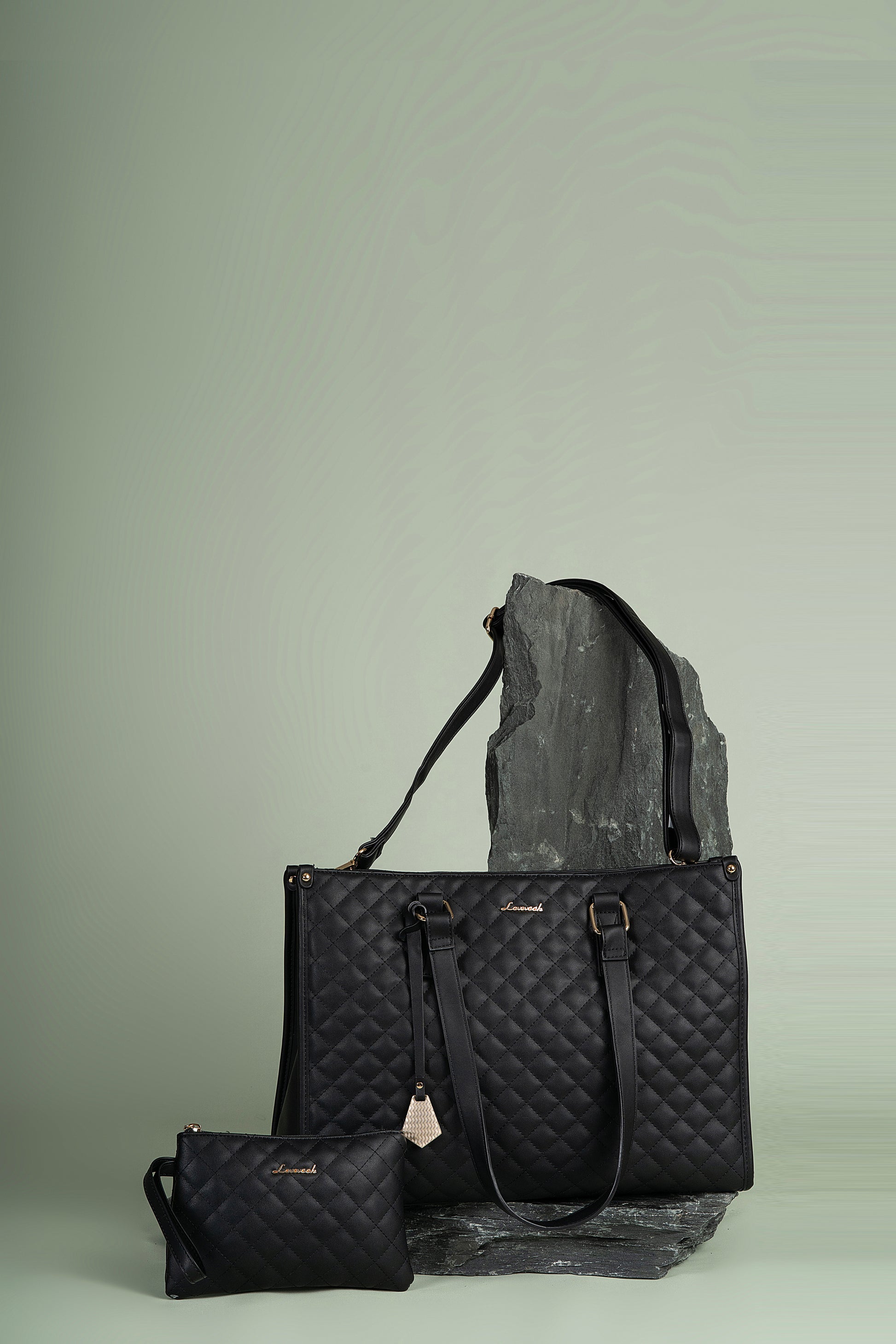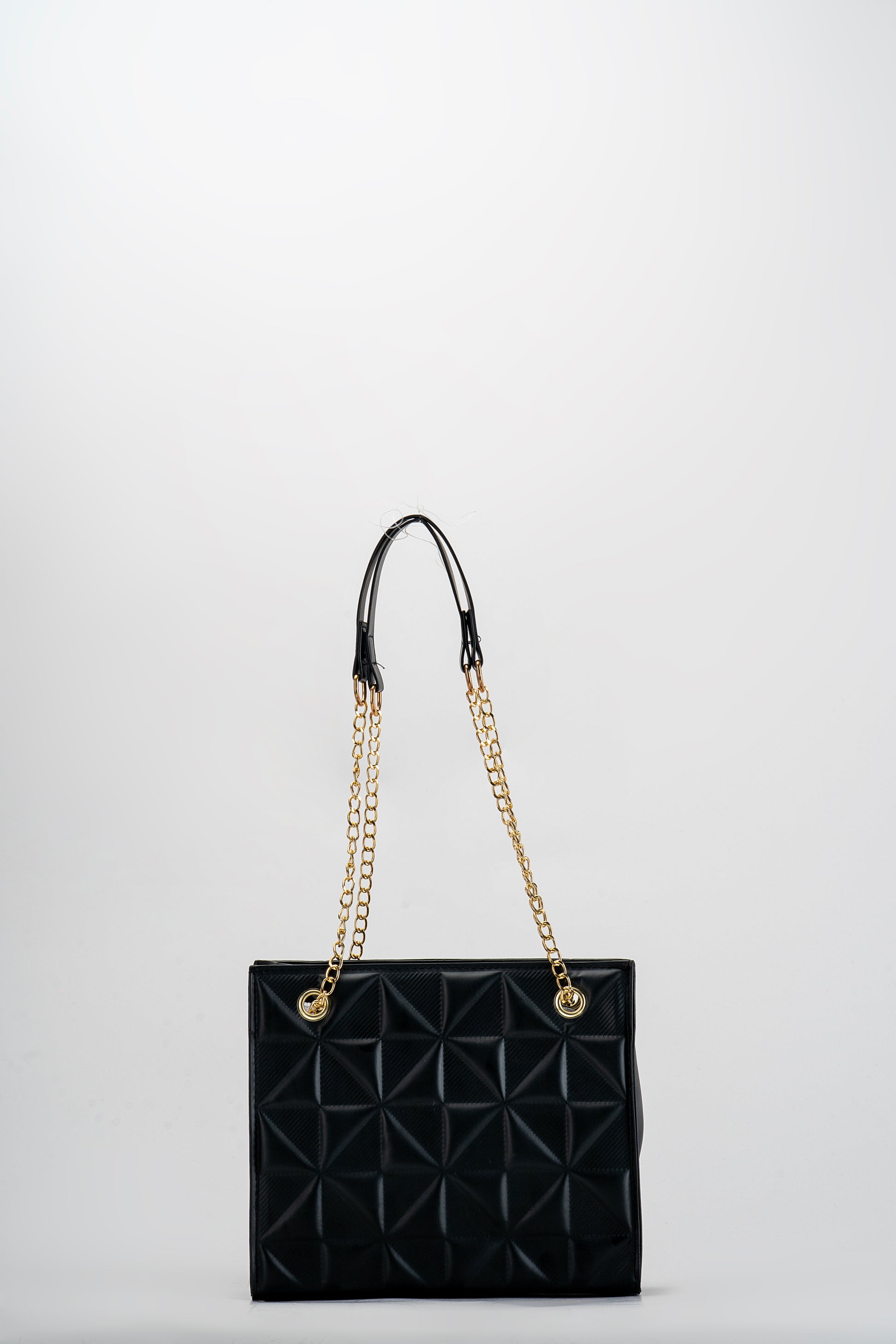 A black tote-style handbag featuring a deeply quilted geometric texture across the body. It has two top handles: one short, smooth black strap and a longer, elegant gold chain strap that can be worn on the shoulder. This structured bag is perfect for daily use or professional settings.