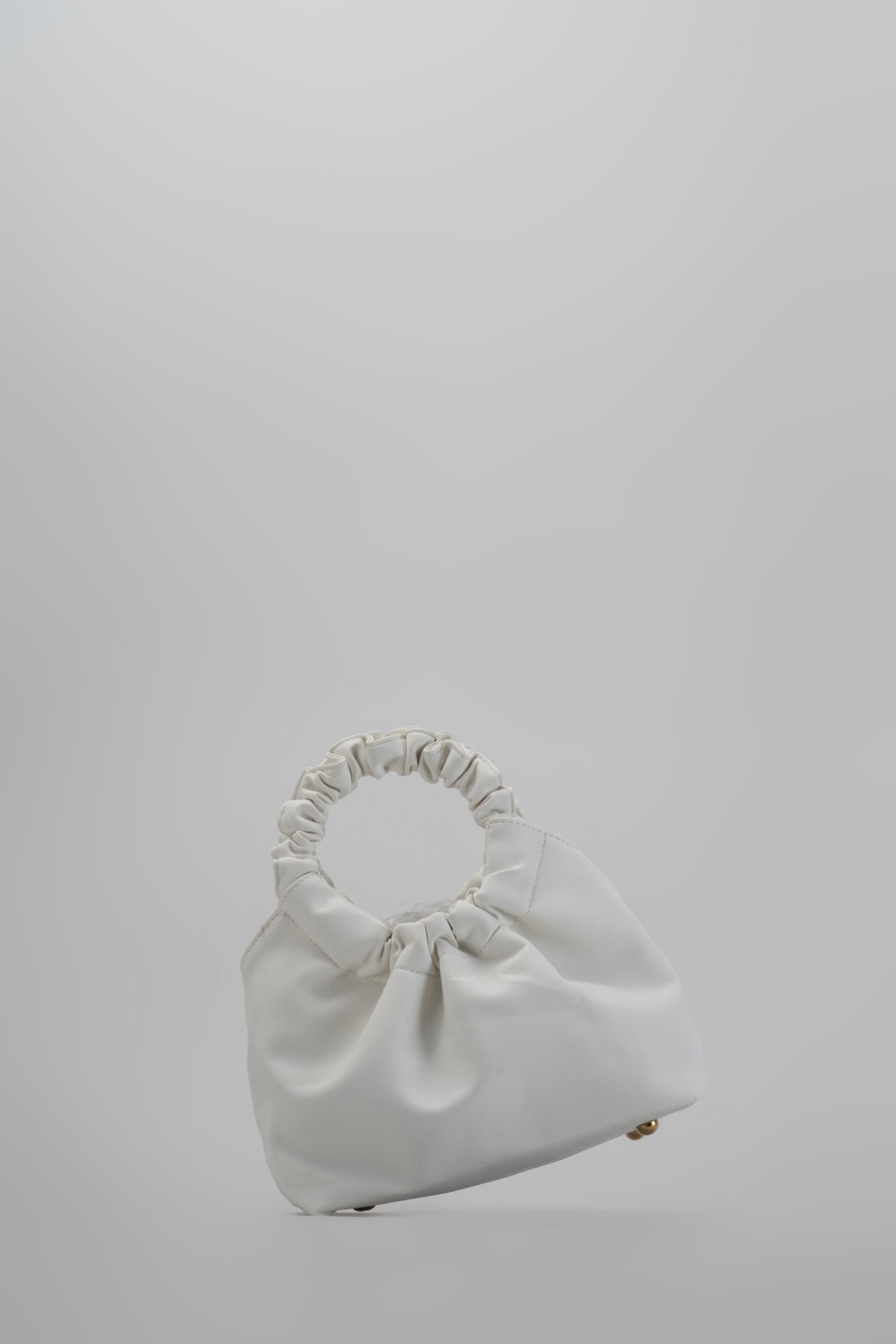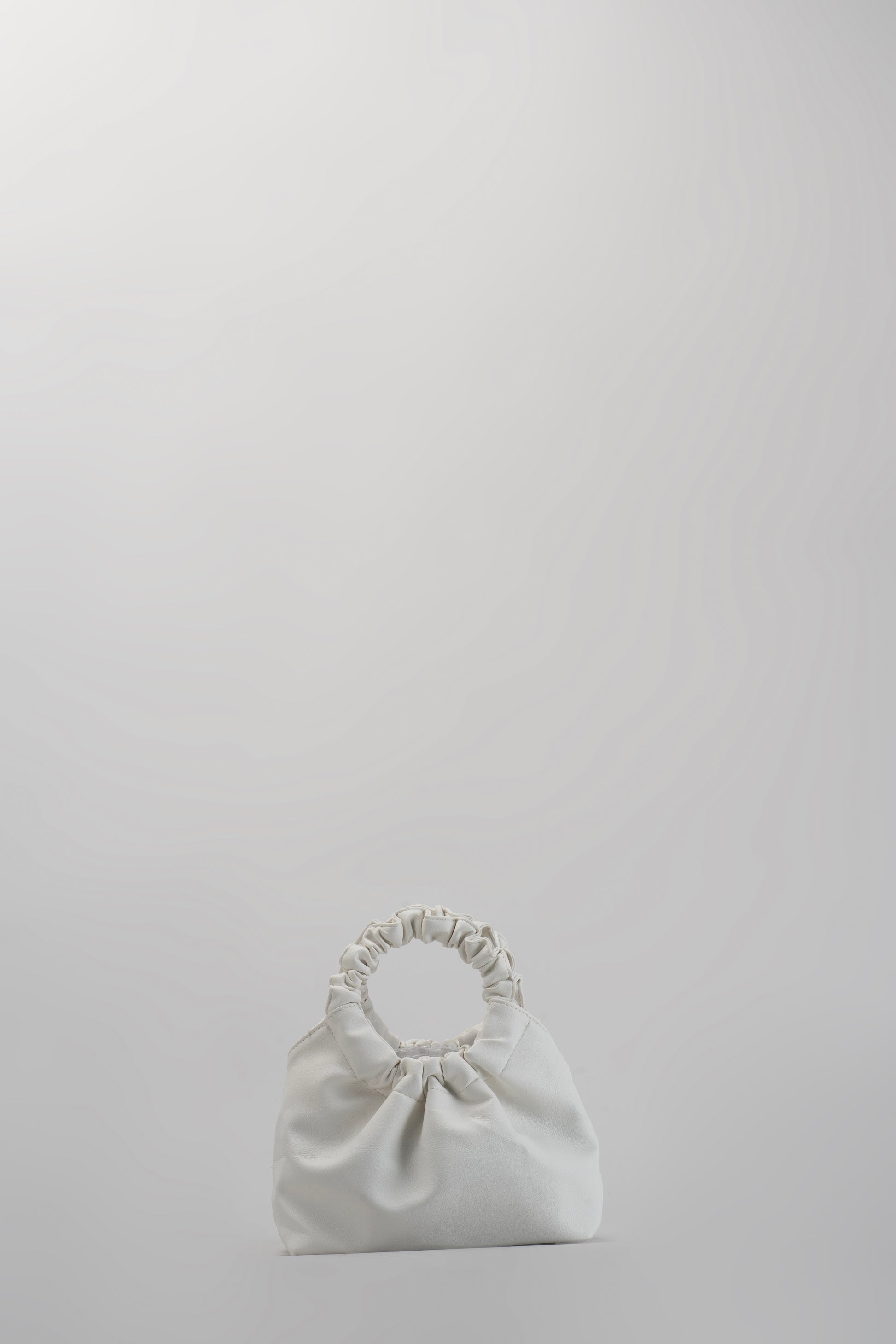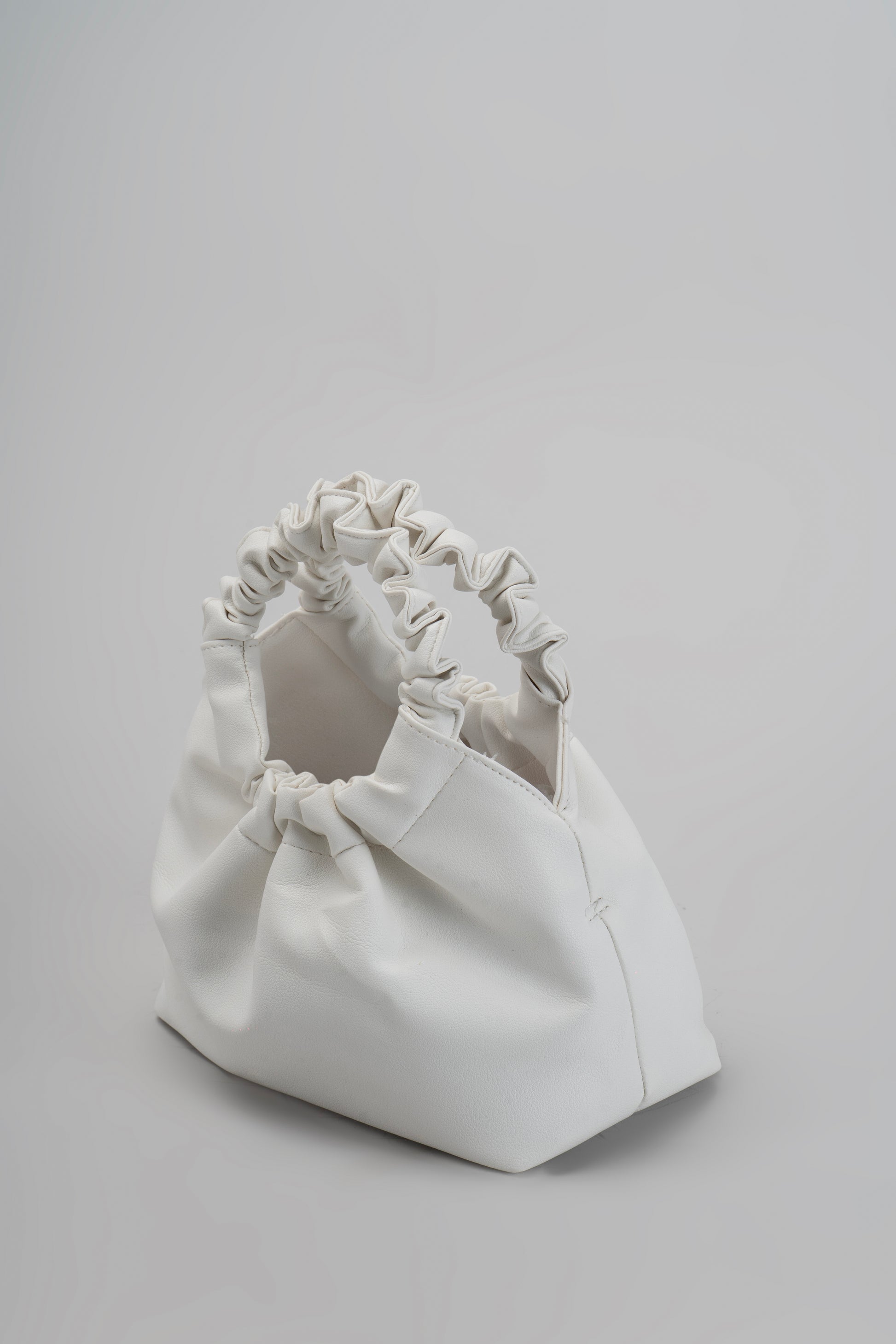 A small, soft white bucket bag with a drawstring closure and a decorative sheer/organza overlay detail. It features a gathered top and a sling strap, offering a delicate, playful look.