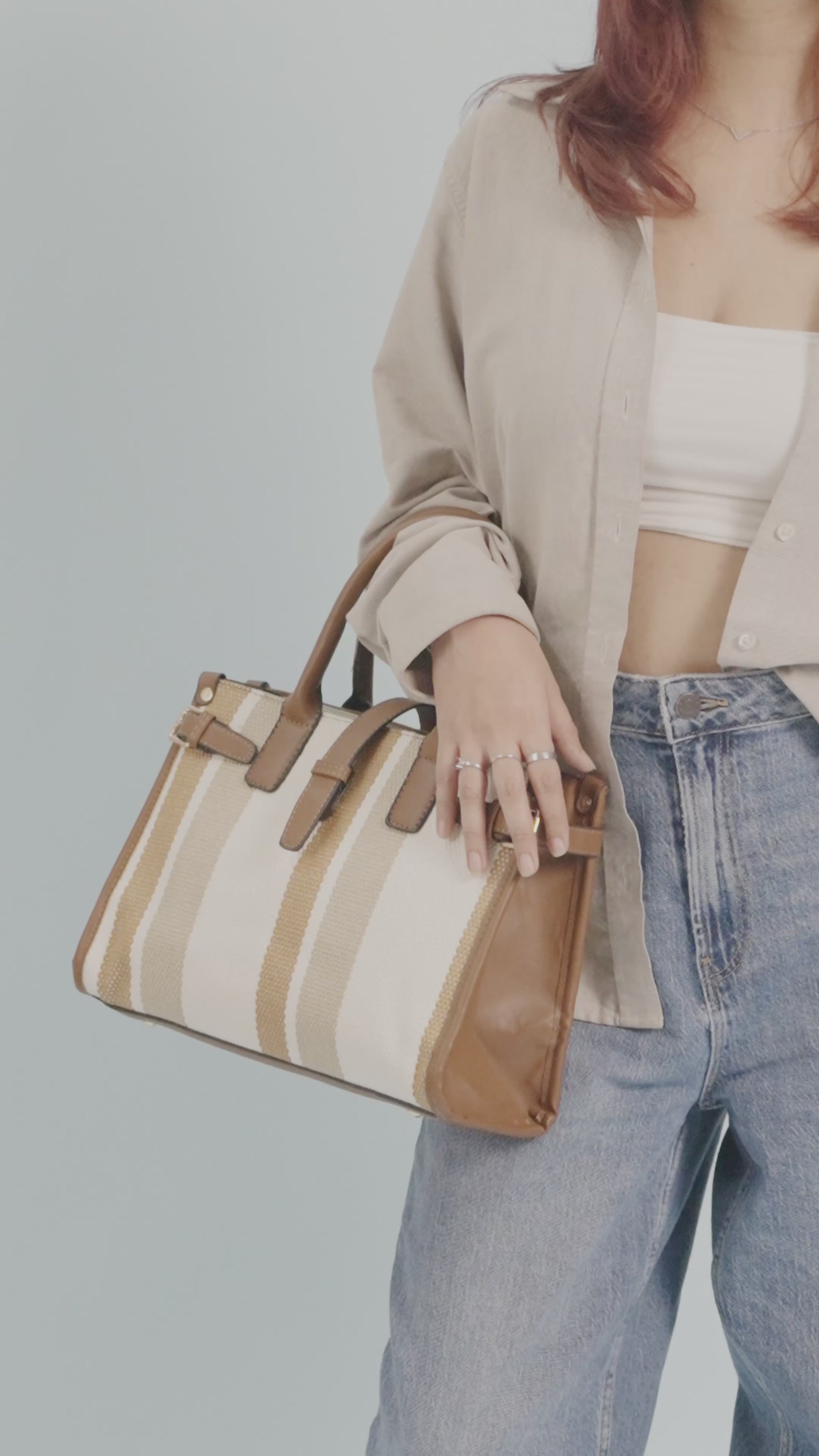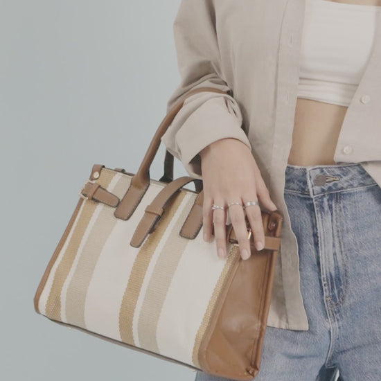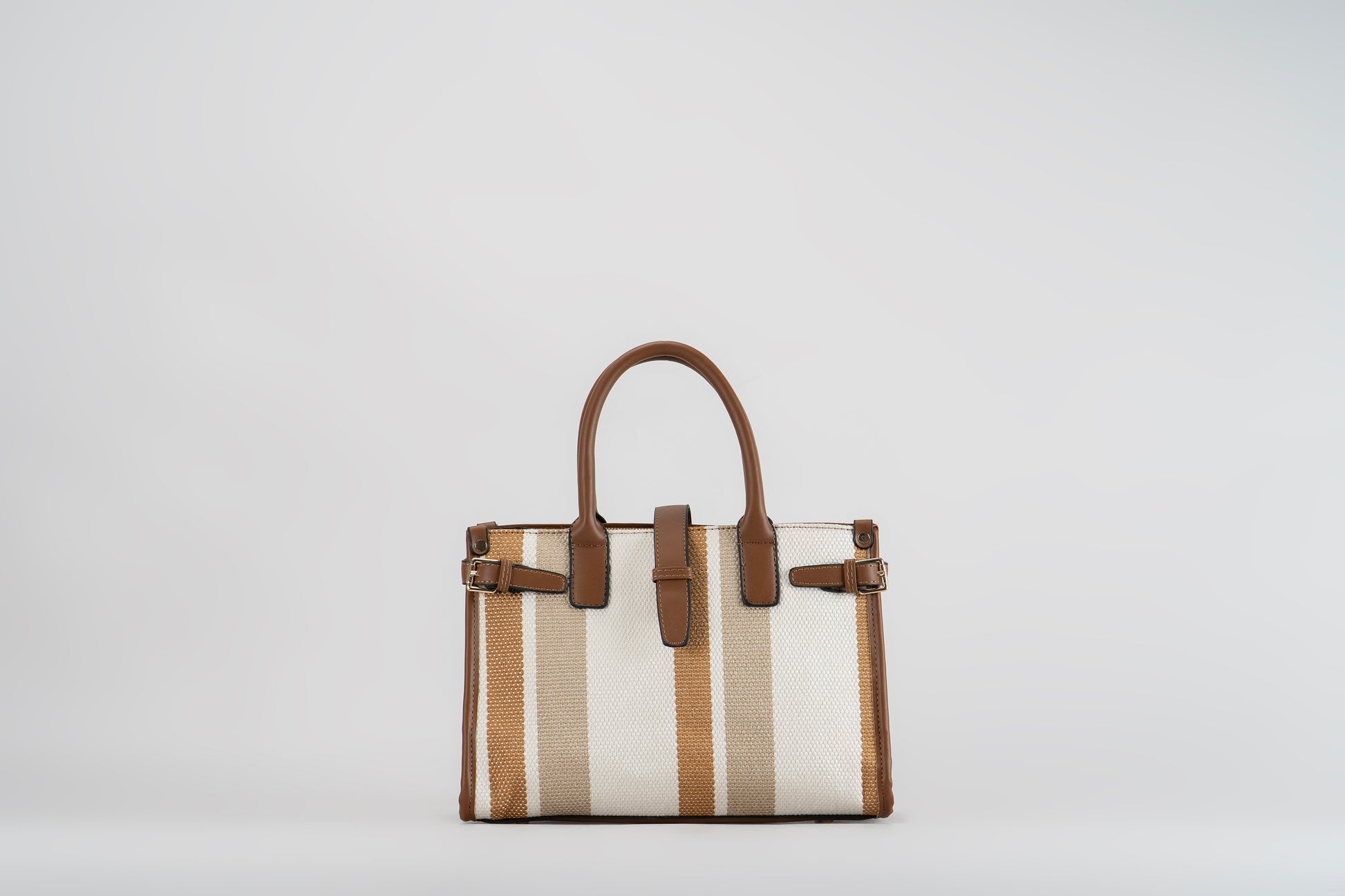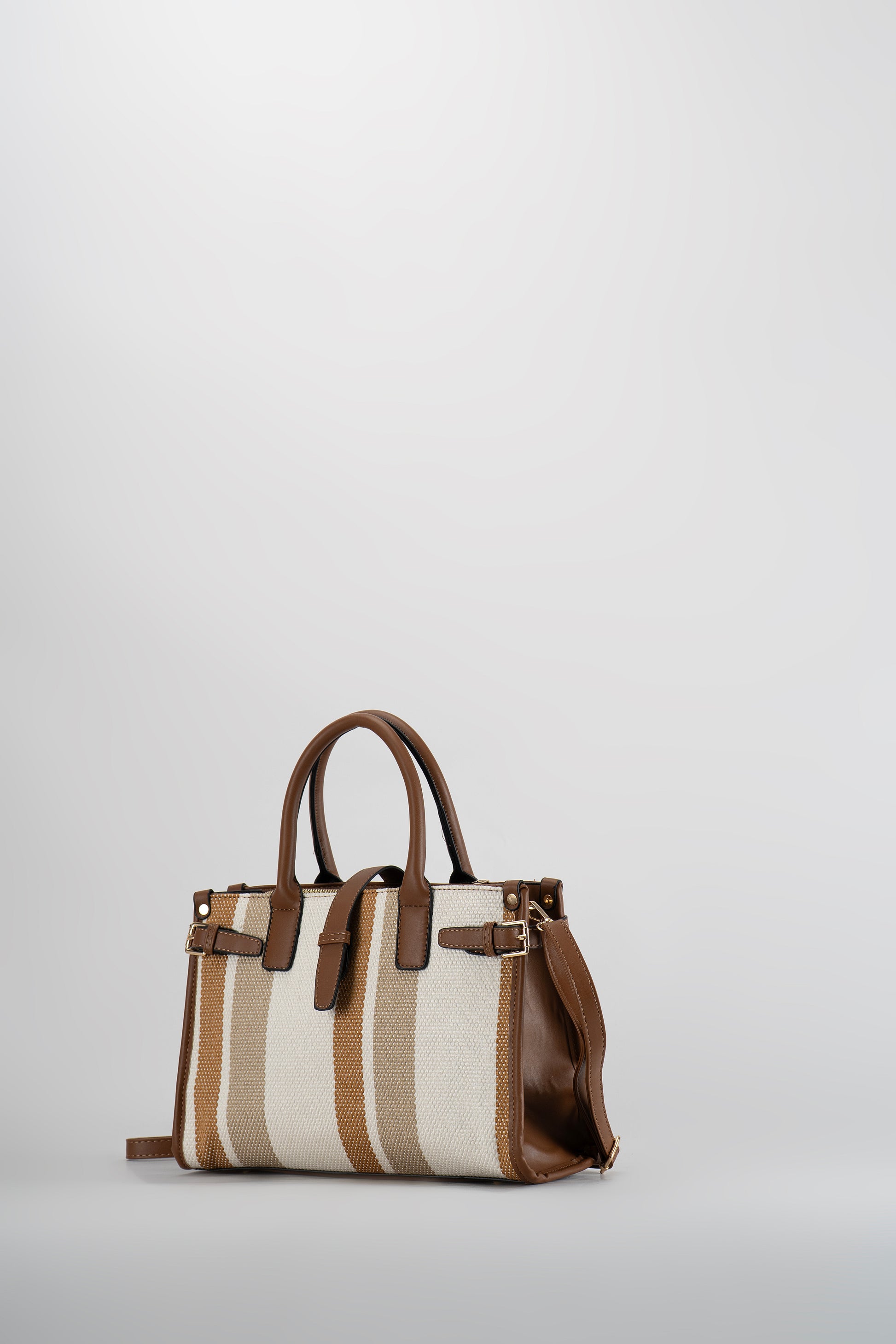 A distinctive, structured bag combining materials. The body features vertical striped fabric (possibly canvas or woven straw) in light and dark tones, trimmed with brown faux leather on the handles and closure straps. It has a classic satchel shape with buckle details.