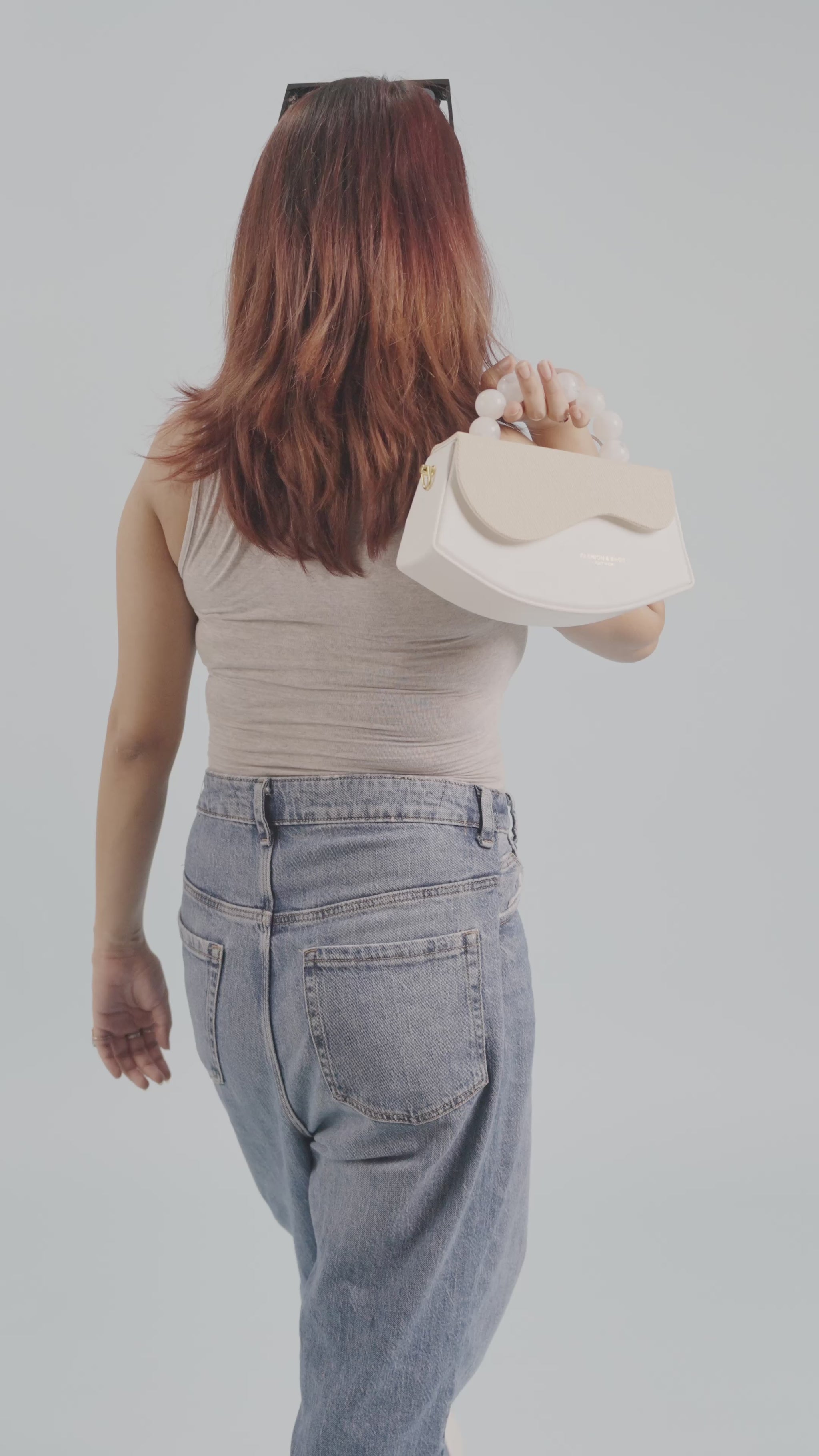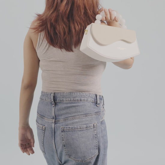 A unique, half-moon shaped sling bag in white and textured beige. It features a unique, clear acrylic top handle in a wavy or circular shape, complemented by a detachable sling strap. Available in blue/white.