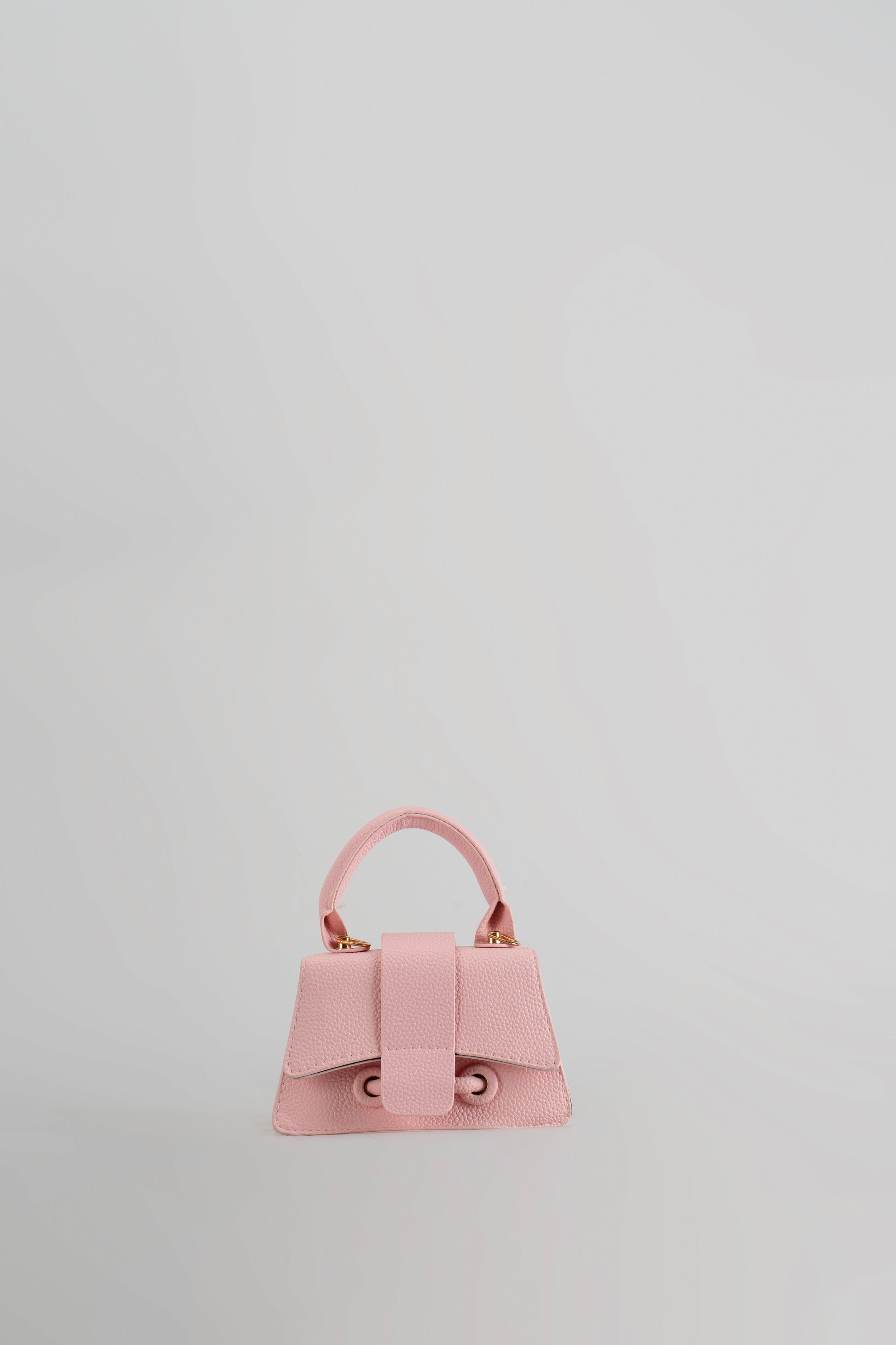A tiny, very structured miniature flap bag shown in a vibrant pink color. It has a simple buckle closure, a single top handle, and a long detachable sling strap. It is also available in light pink and brown.