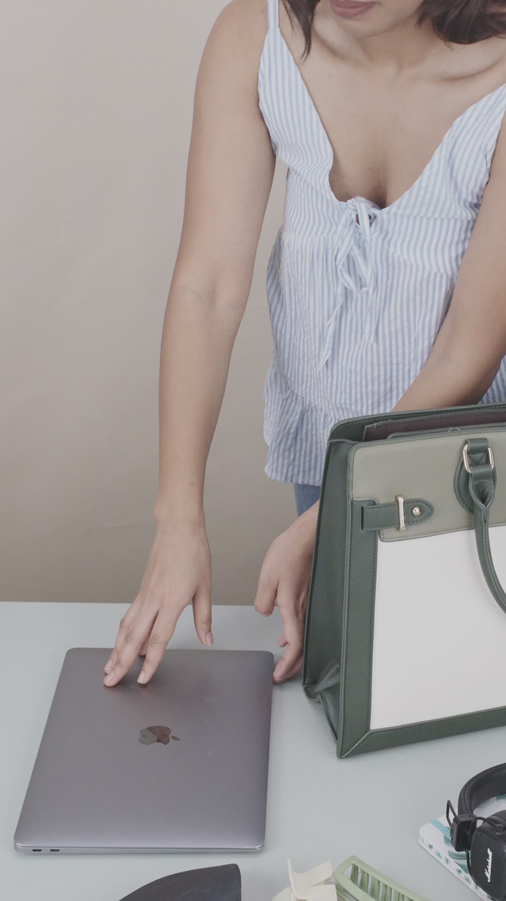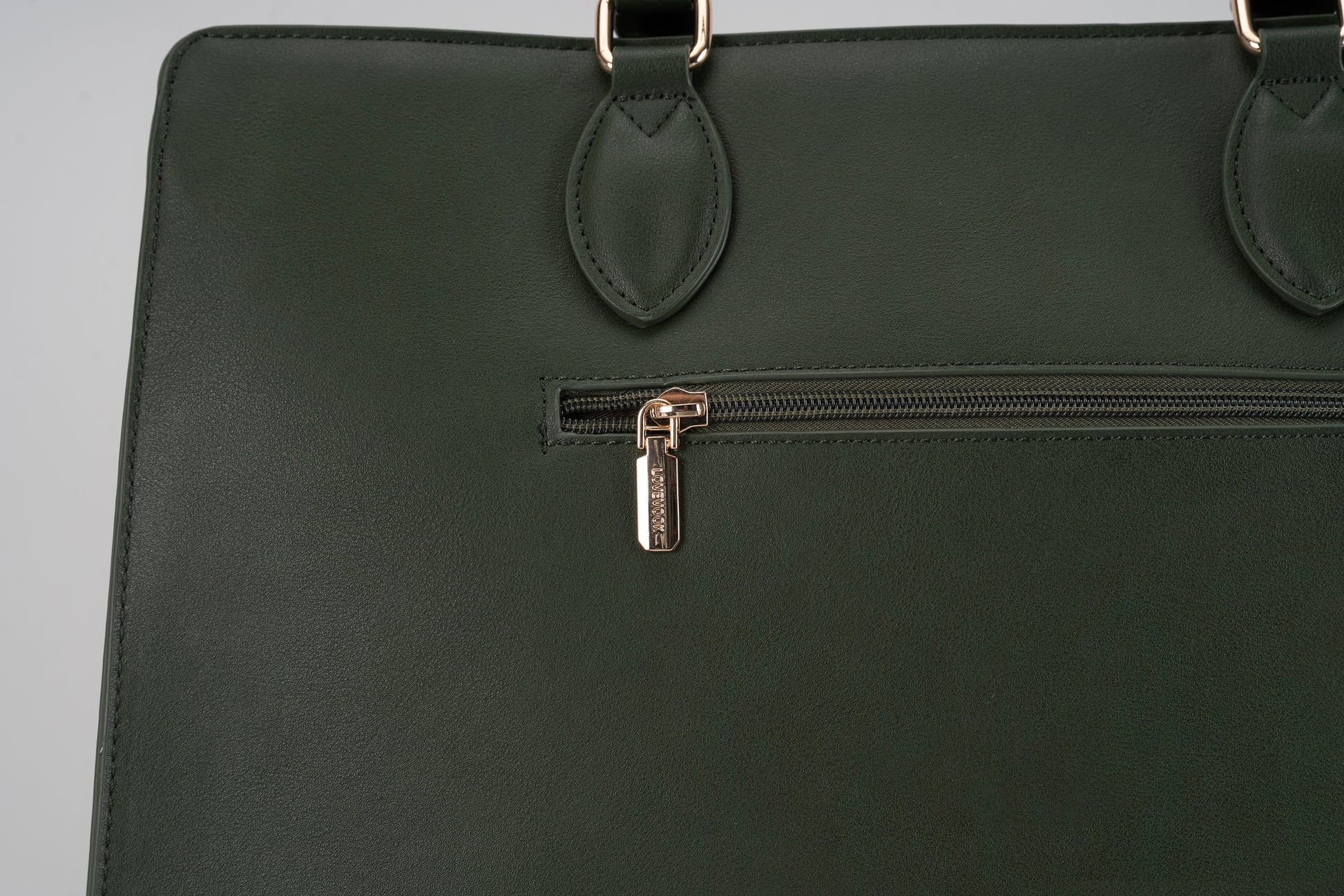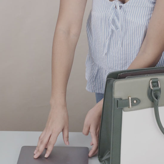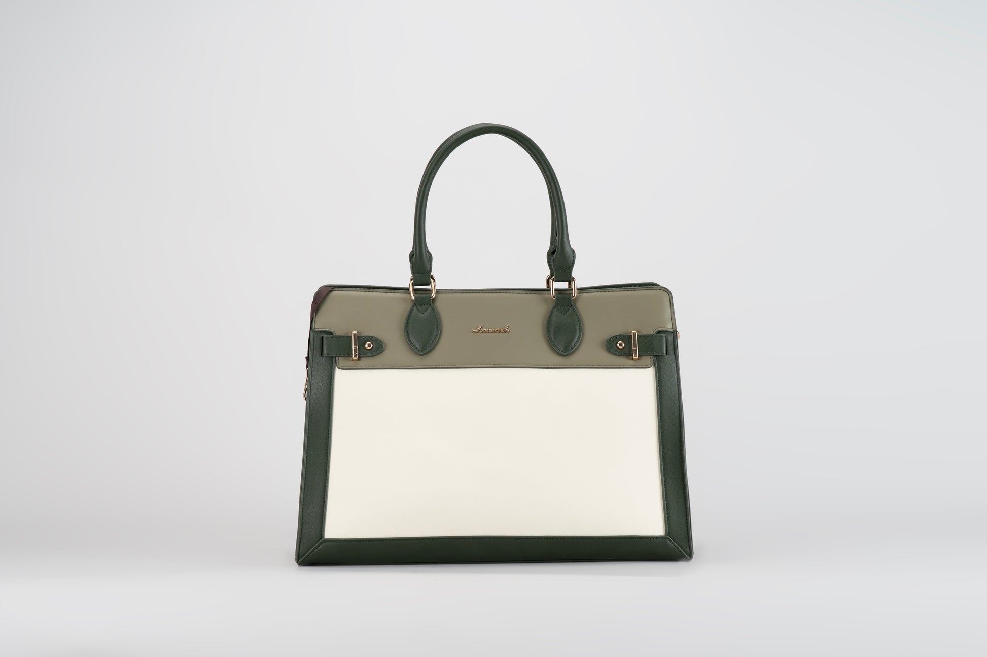 A chic, structured color-block tote bag with a briefcase-inspired design. It features sections of olive green and off-white, and is accented with strap and buckle details near the top handles. It includes a long, adjustable sling strap.