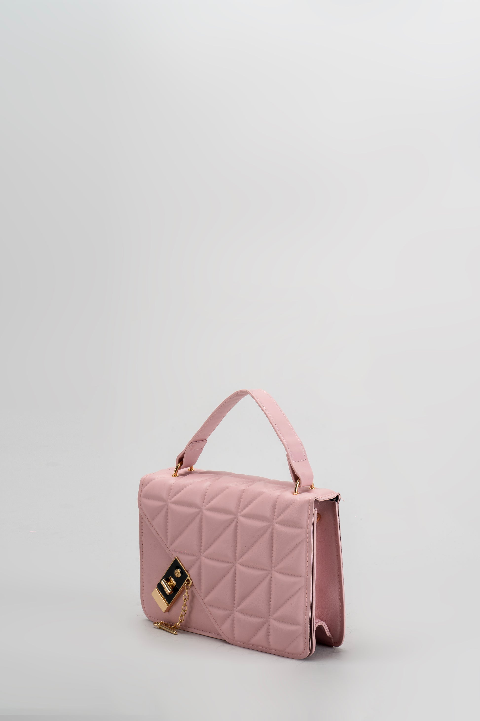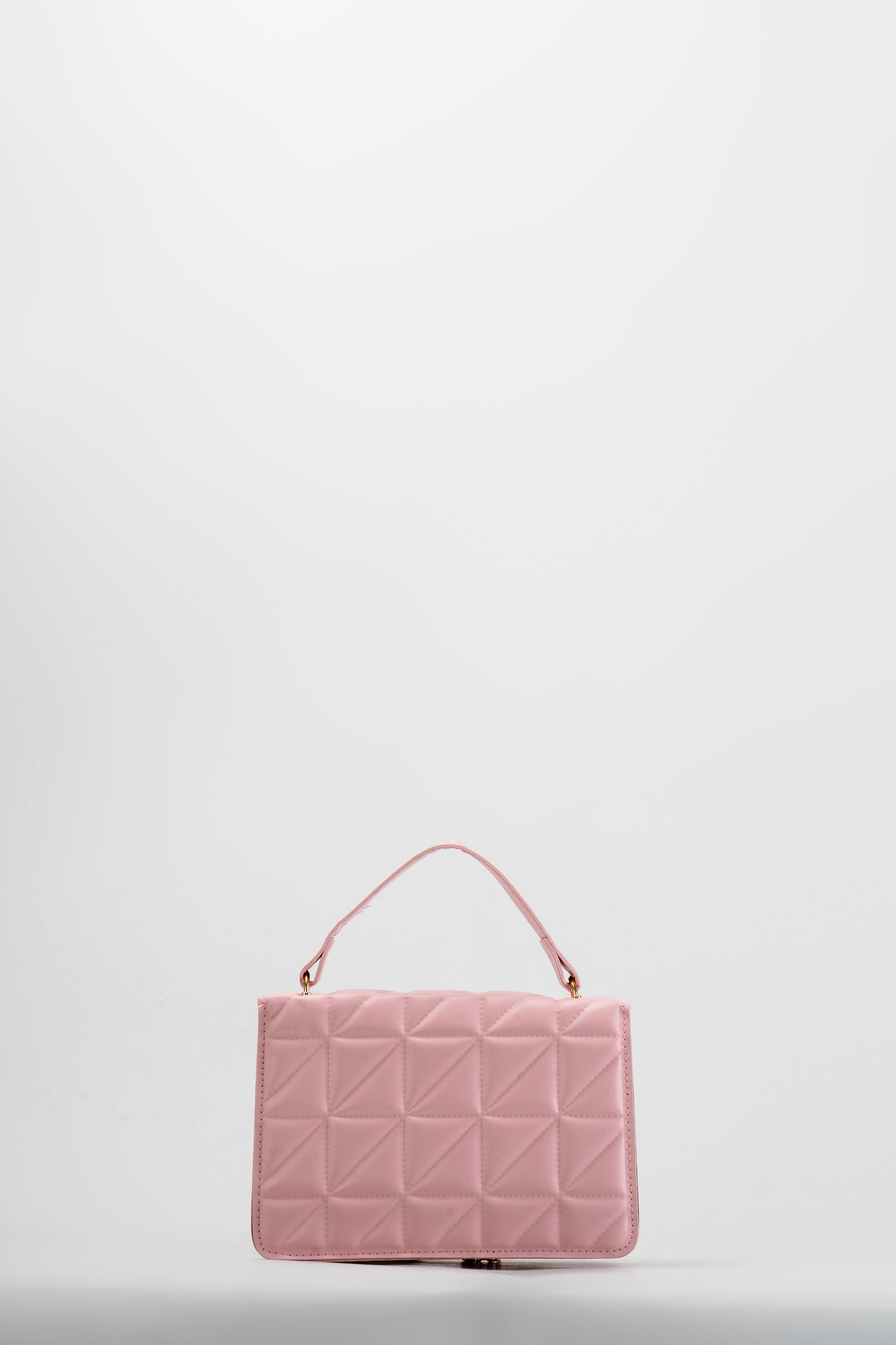 A soft, rounded mini-crossbody in pink, featuring a distinct quilted geometric pattern across the entire body. It often includes a matching miniature accessory pouch attached to the strap.