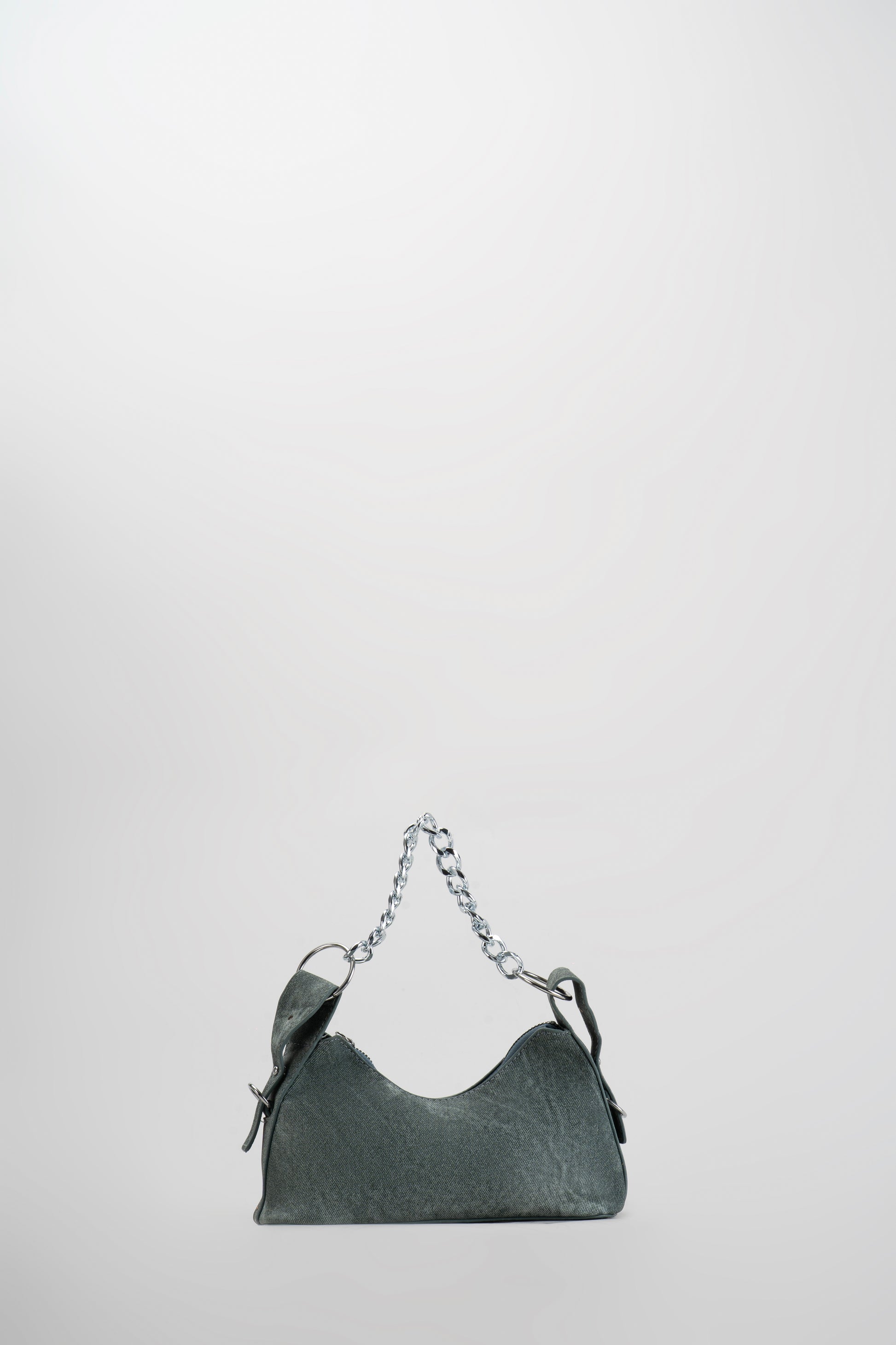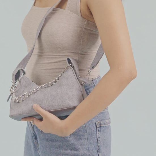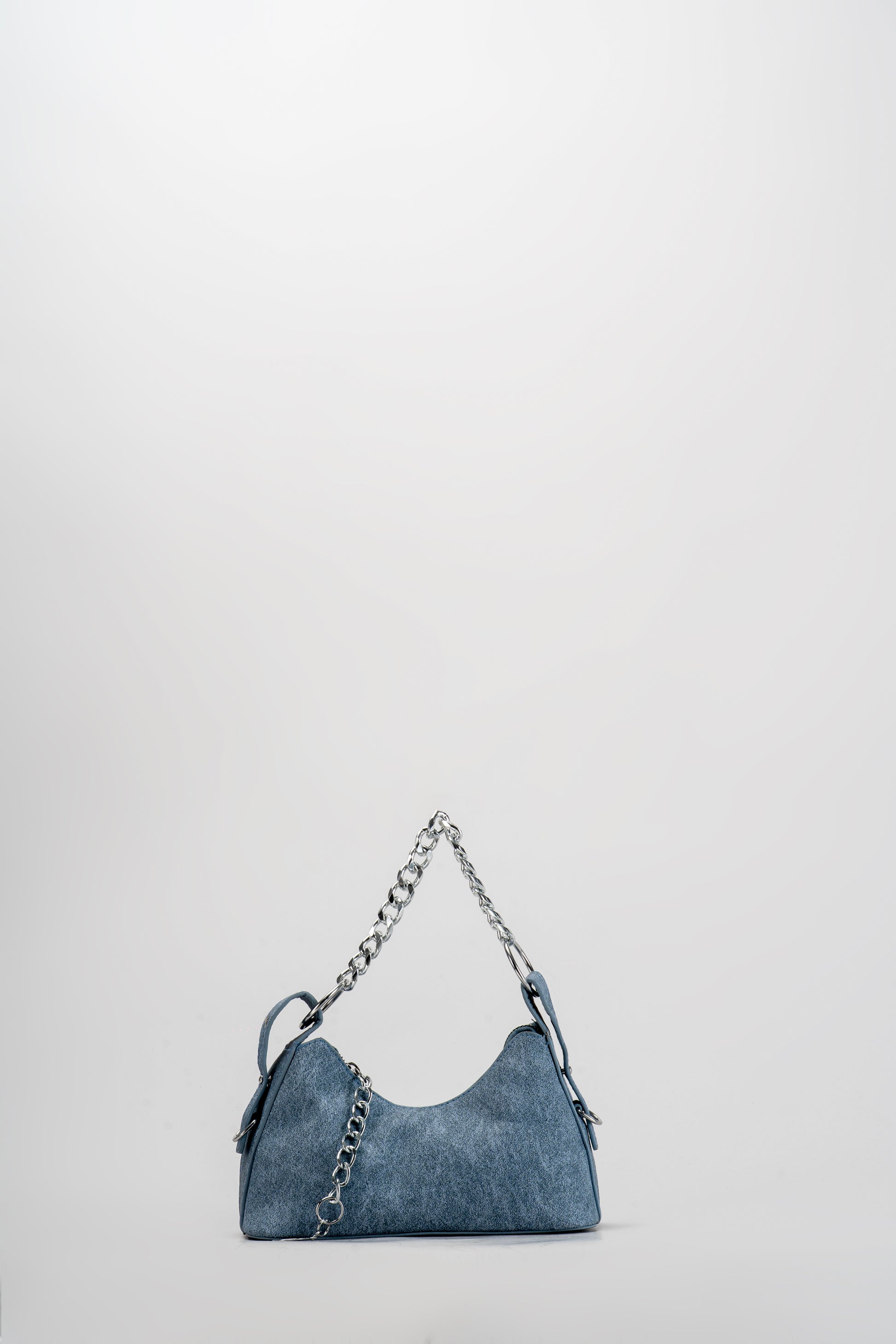 A casual, crescent-shaped mini-shoulder bag made from blue denim or textured fabric. It features an edgy, silver-tone chain shoulder strap and a slight slouchy form.