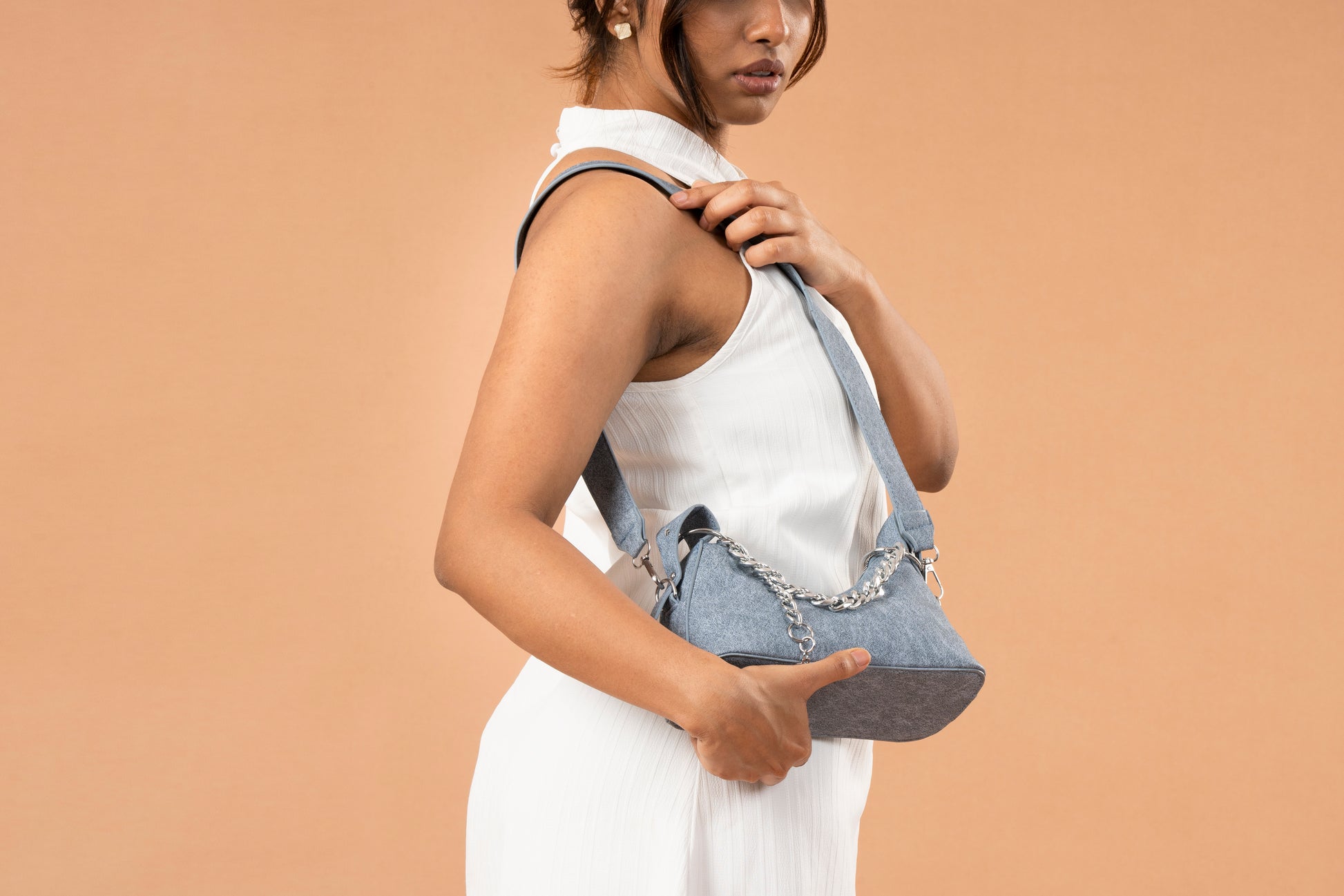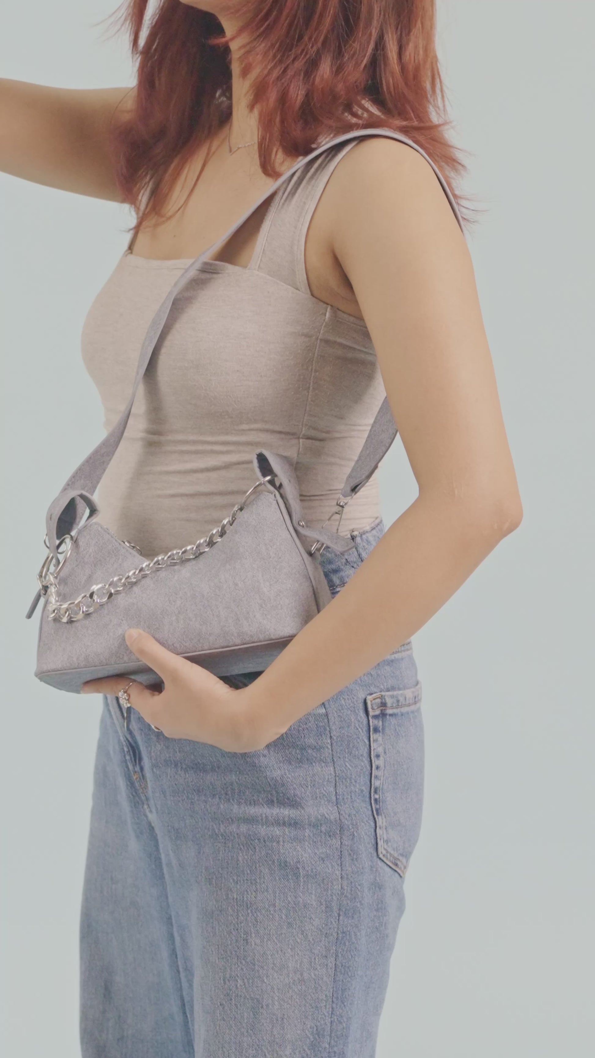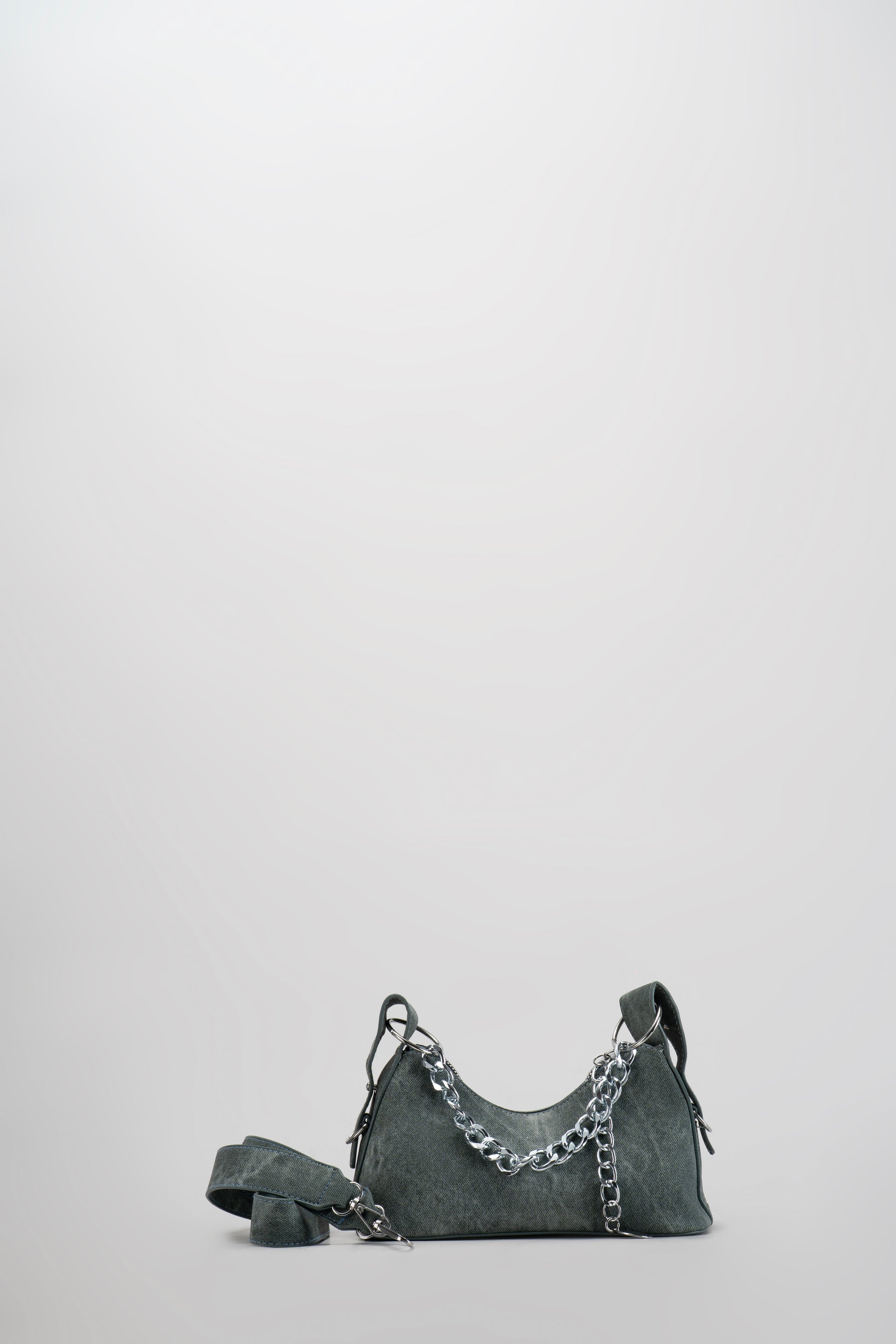 A casual, crescent-shaped mini-shoulder bag made from blue denim or textured fabric. It features an edgy, silver-tone chain shoulder strap and a slight slouchy form.