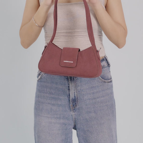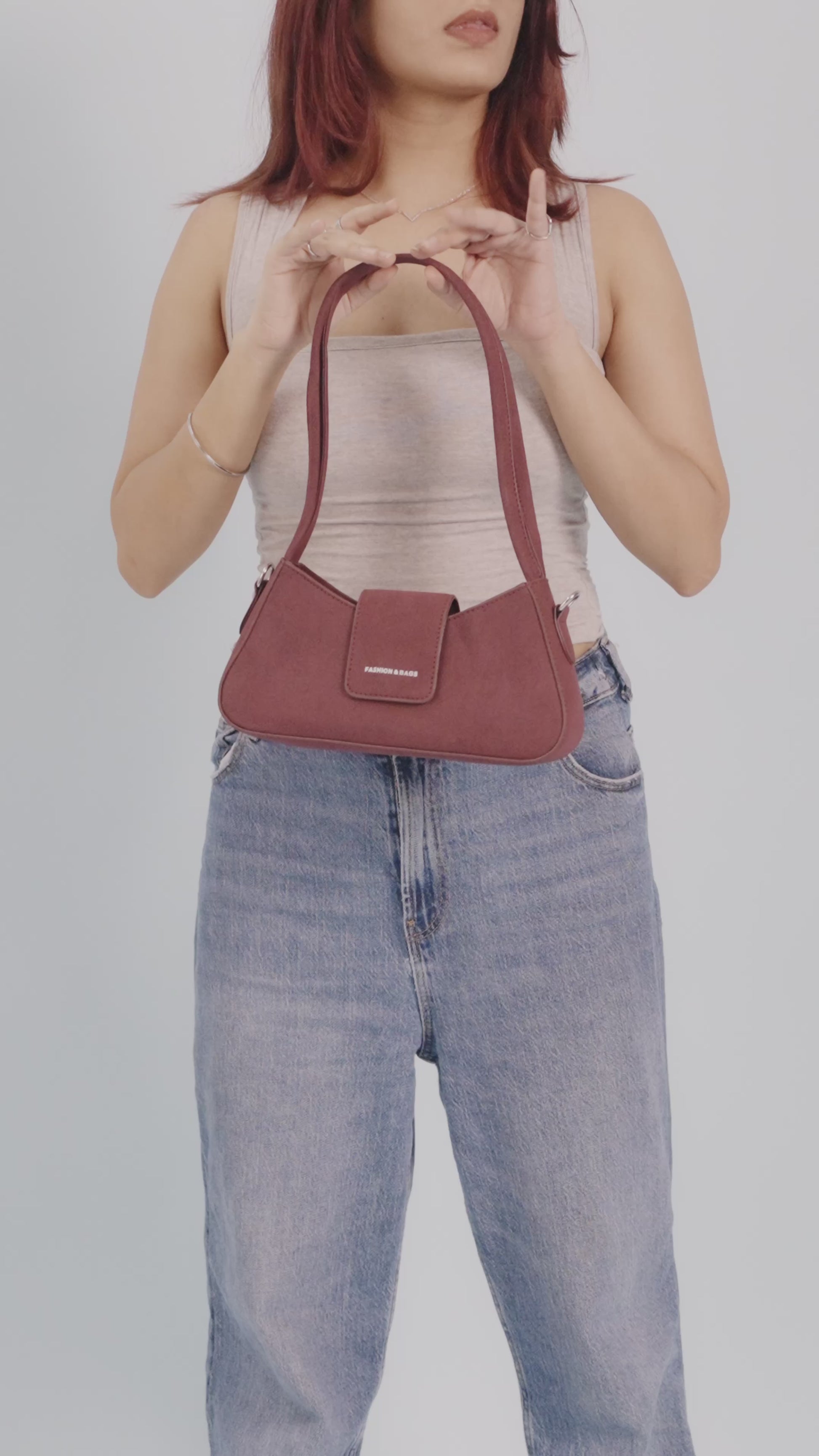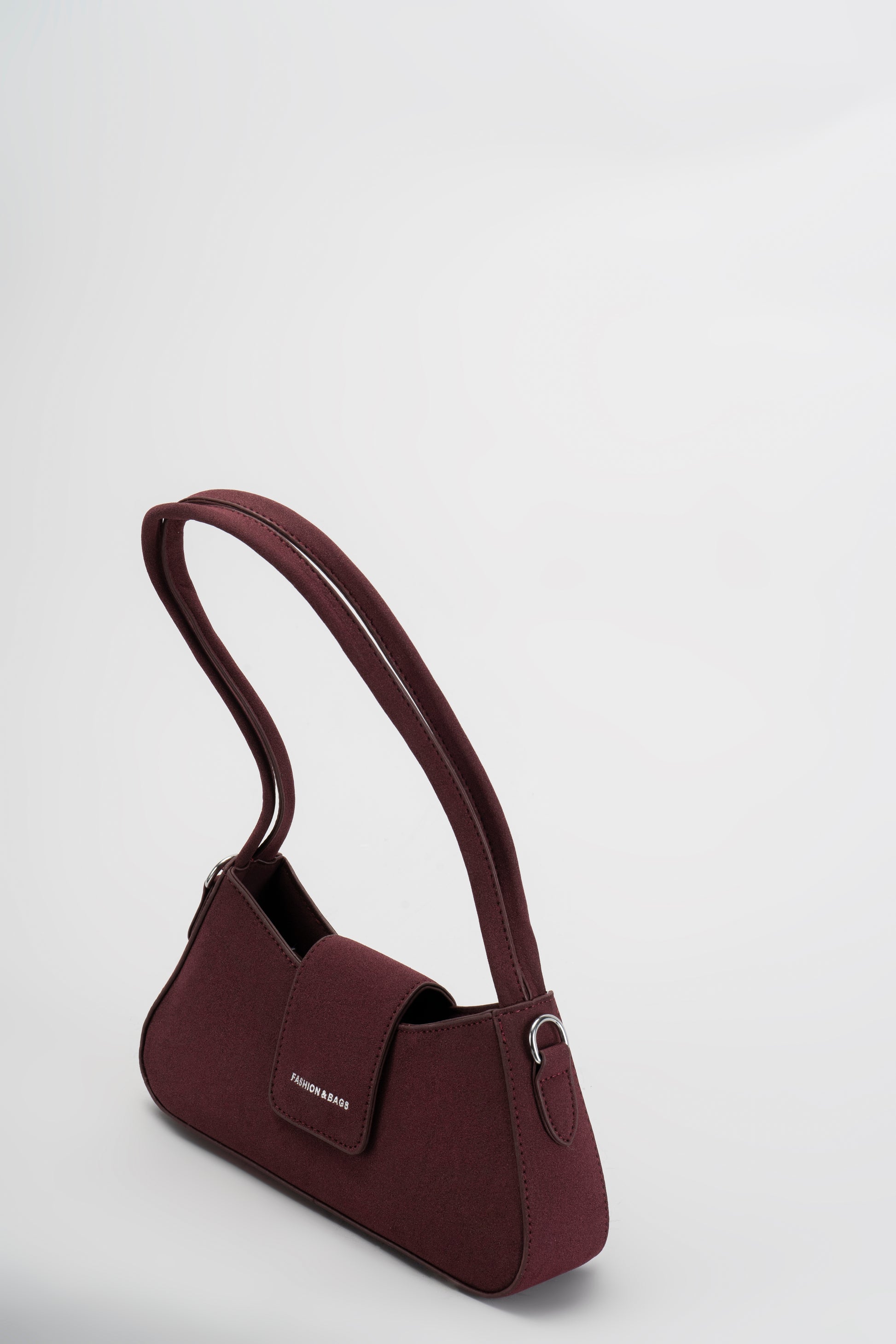A sleek, crescent-shaped shoulder bag in a rich deep red or maroon color. It features a smooth finish, a single strap designed to sit snugly under the arm, and a simple front flap with a metal closure, offering a trendy '90s-inspired look.