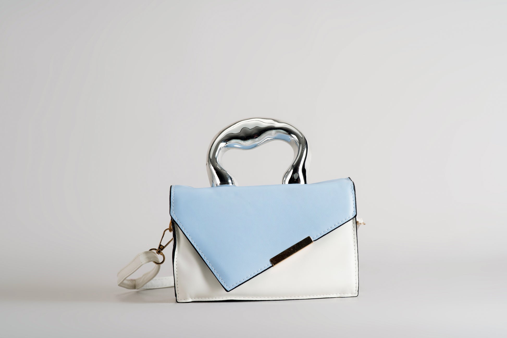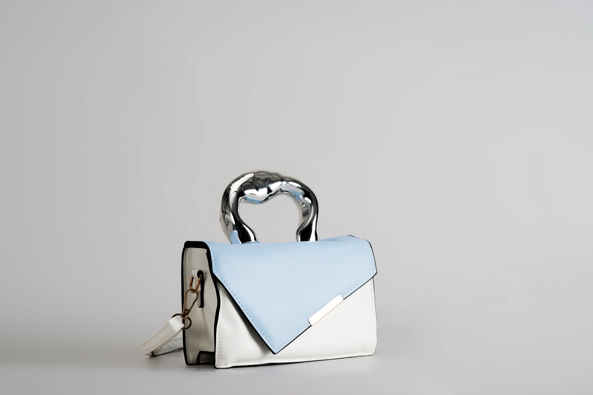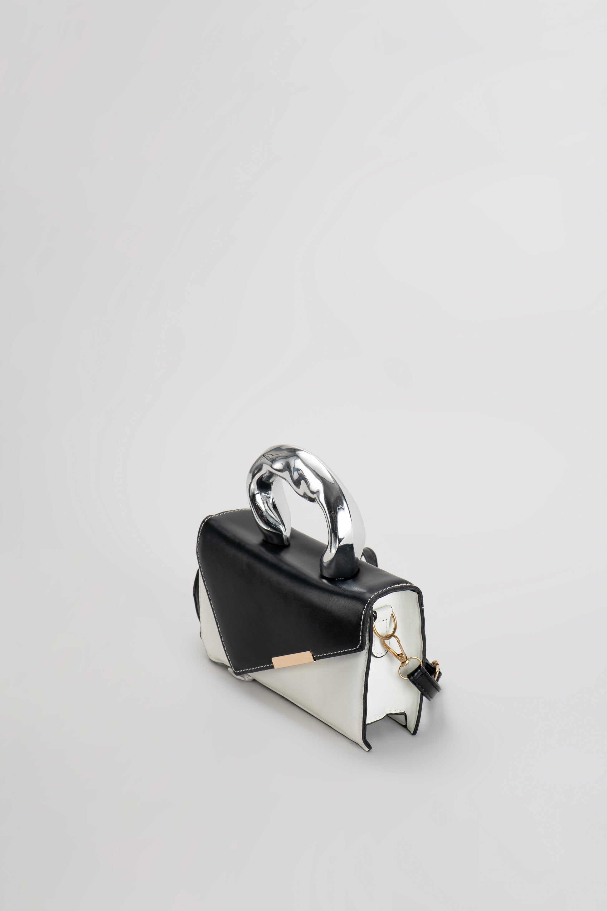 A miniature trapezoid-shaped bag featuring a bold color-block design (white, beige, and brown). Its most unique feature is the large, polished silver, rounded ring handle for carrying, complemented by an adjustable sling strap.