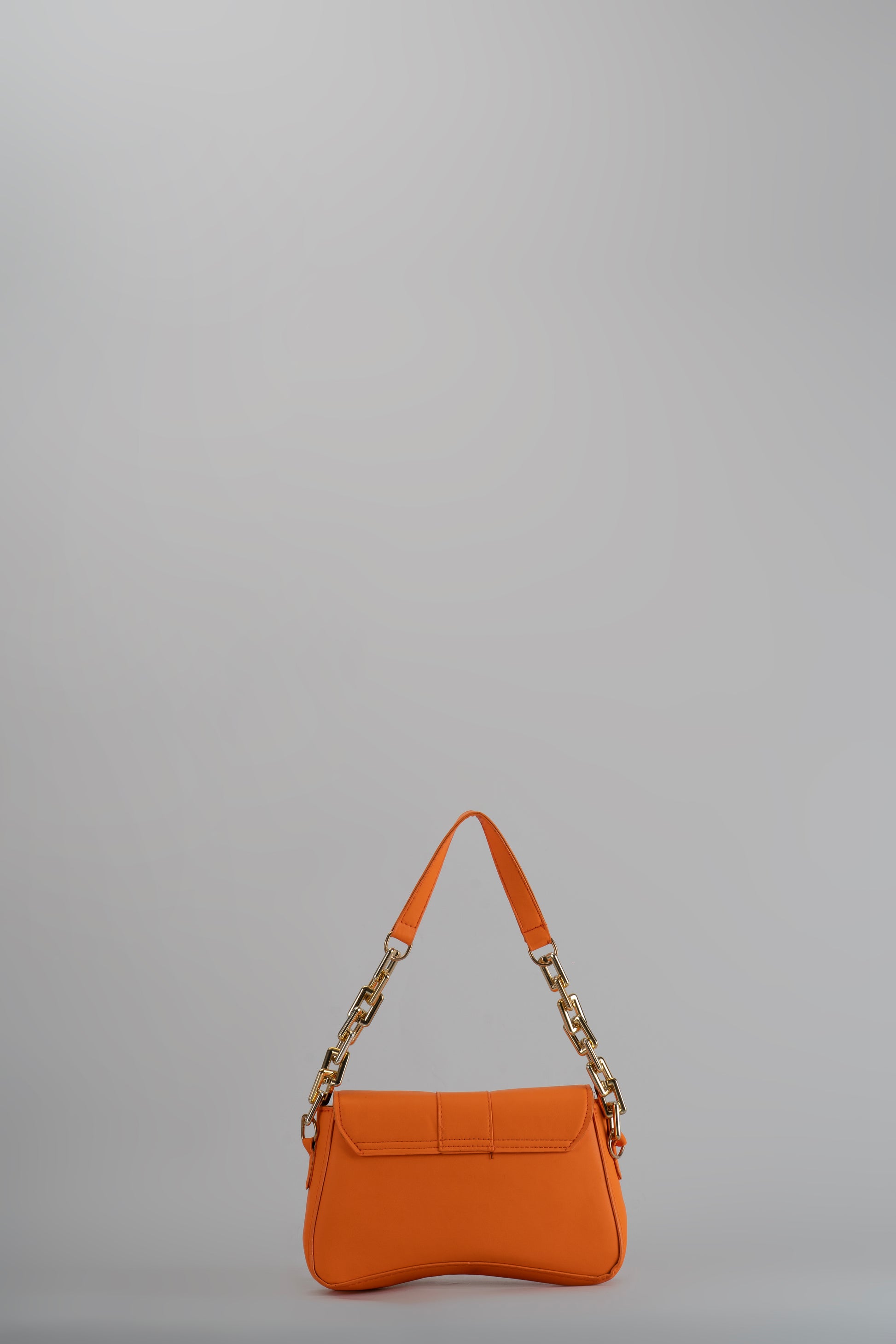 A vibrant orange mini-bag with a semi-slouchy design. It features a smooth shoulder strap partially accented with a gold chain section, and a small quilted panel on the front flap.