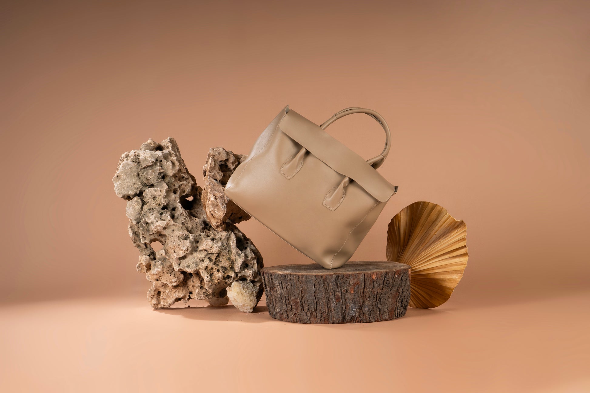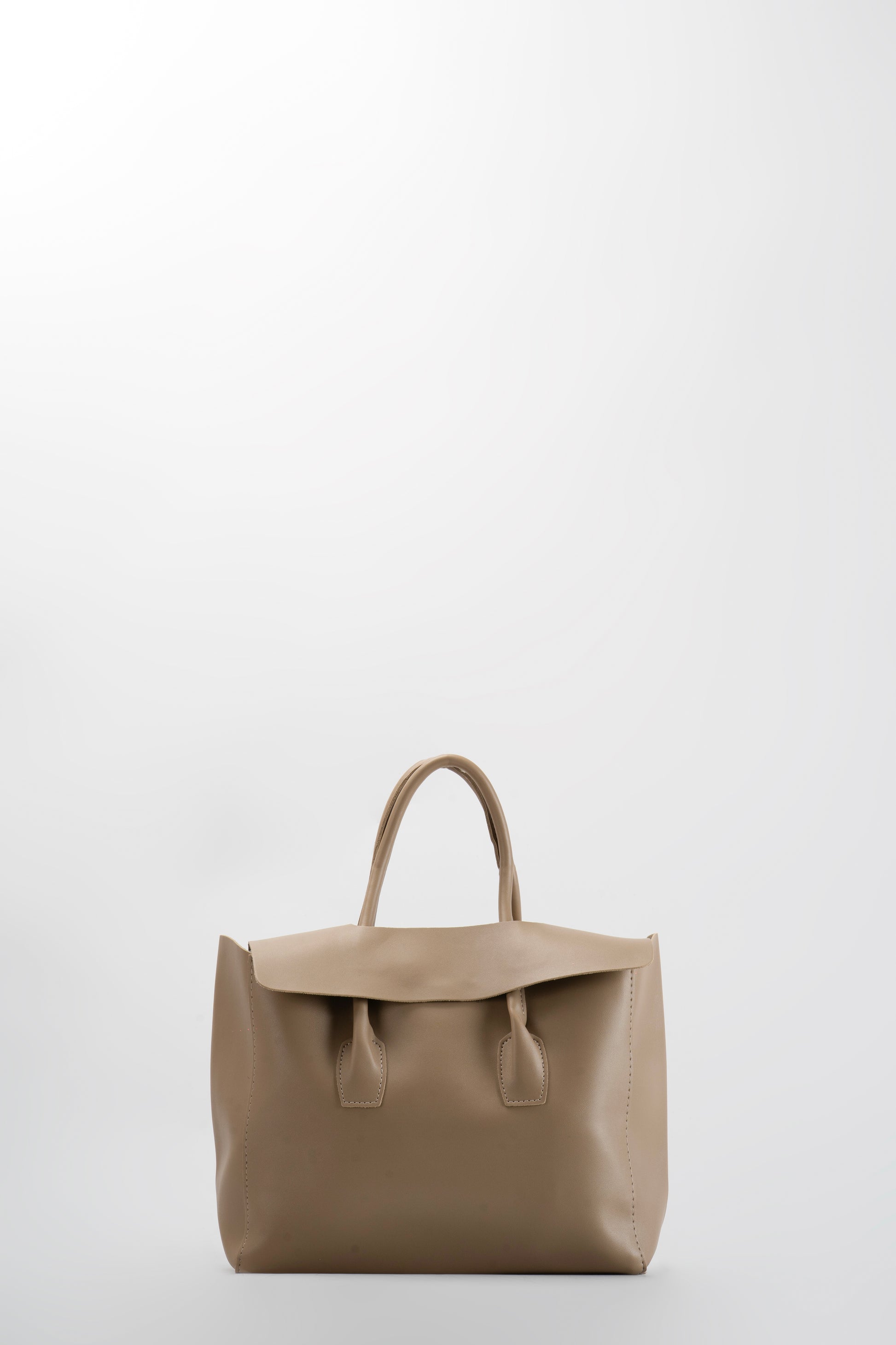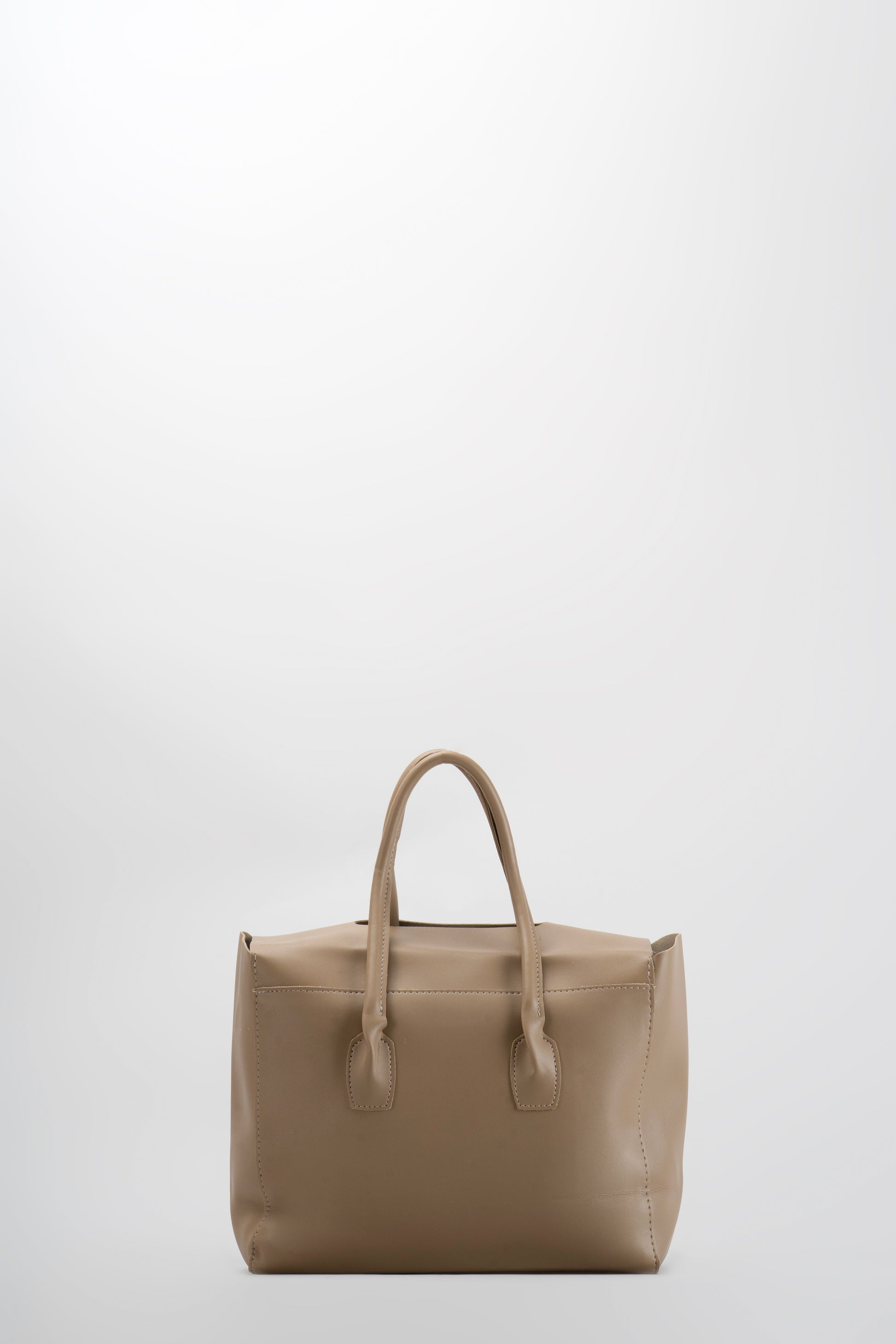 A sophisticated, structured satchel or tote bag in a smooth tan or nude beige color. It features clean lines, two sturdy top handles, and a roomy shape, making it ideal for carrying essentials.