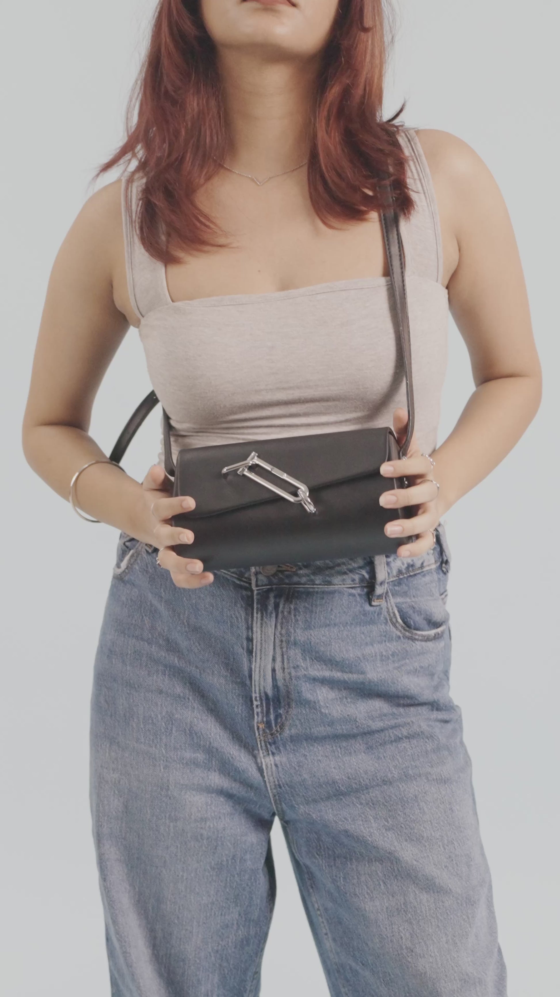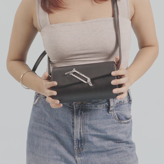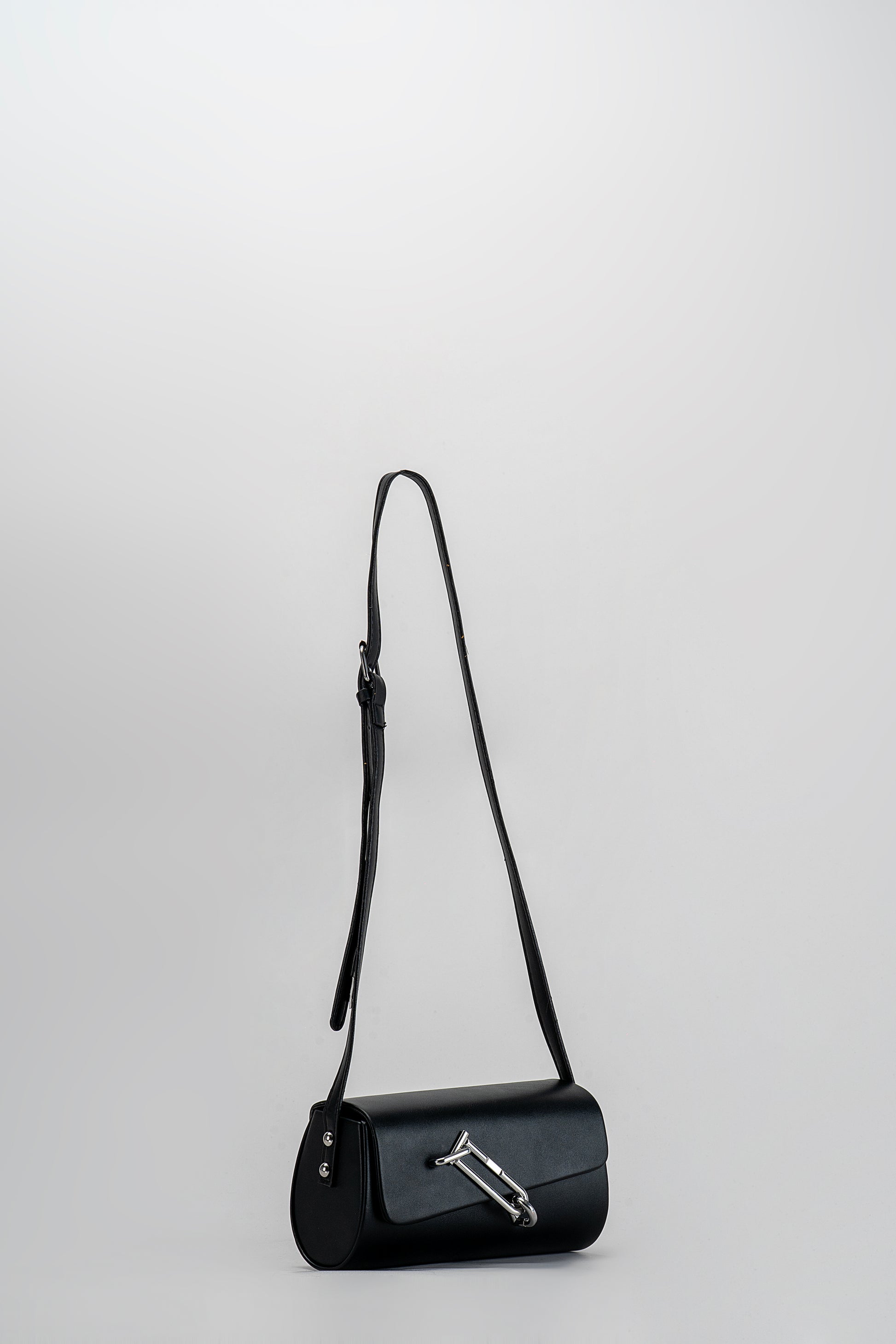 A sleek, black rectangular sling bag with a smooth finish. It has a detachable, long adjustable strap and a prominent, decorative silver-tone buckle or hardware detail on the front flap.