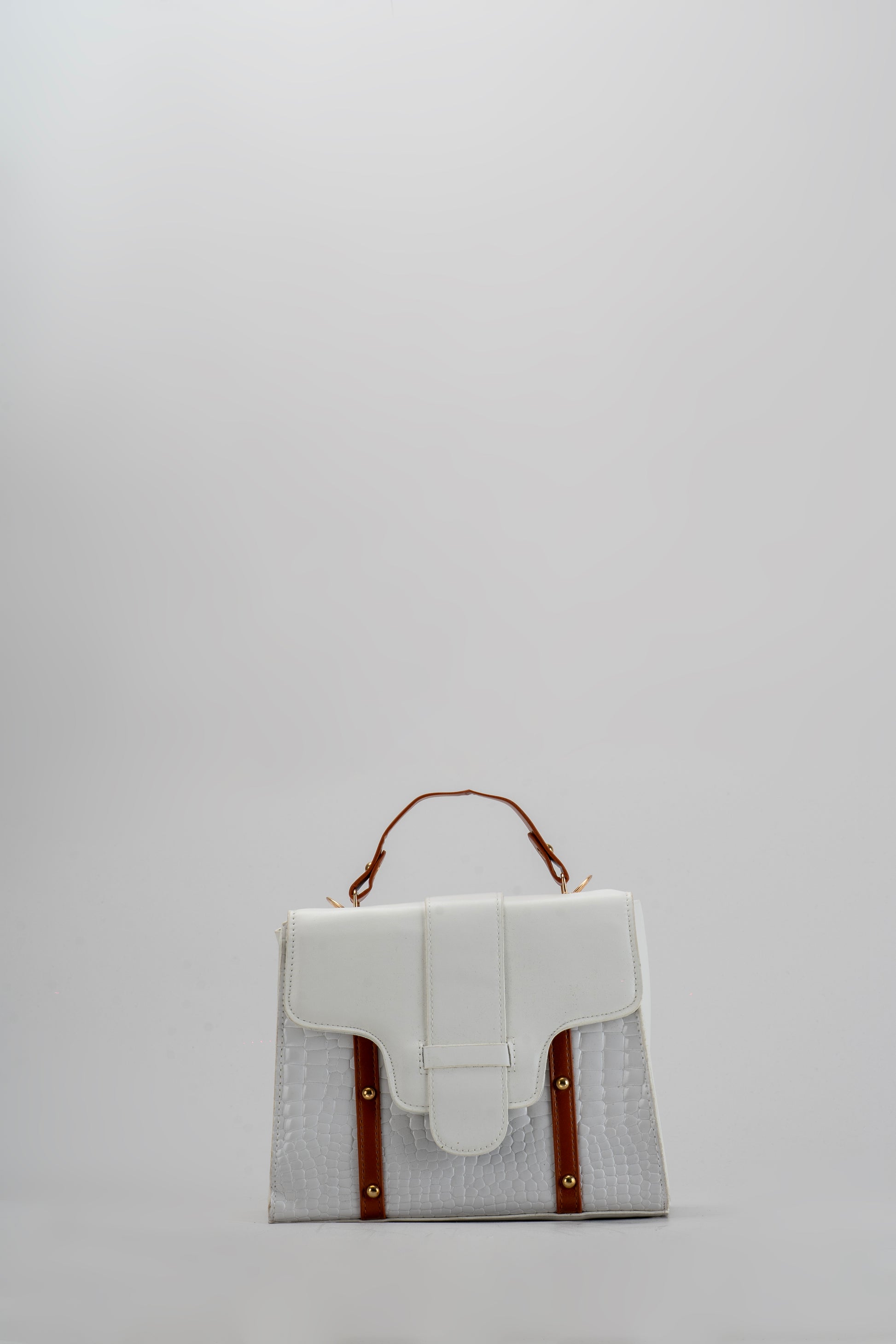 A distinctive, structured sling bag in white that incorporates a clear or textured panel on the front, offering a modern, mixed-material look. It has brown trim and a white adjustable strap.