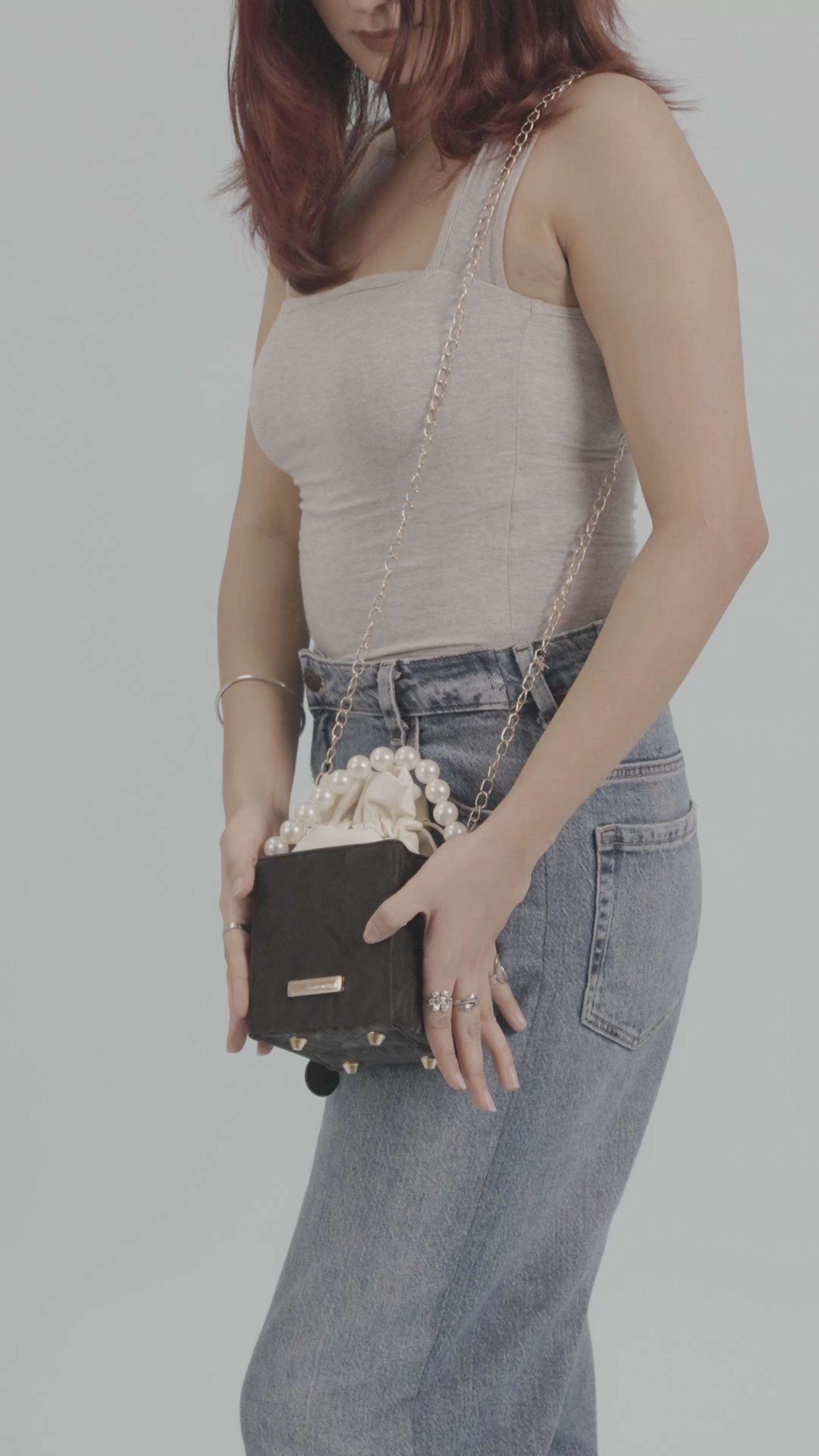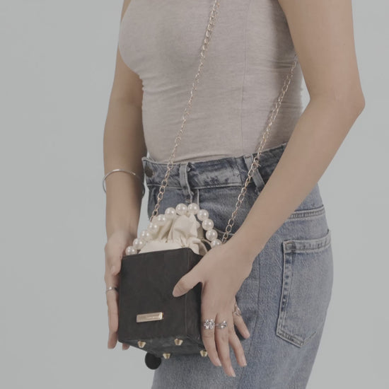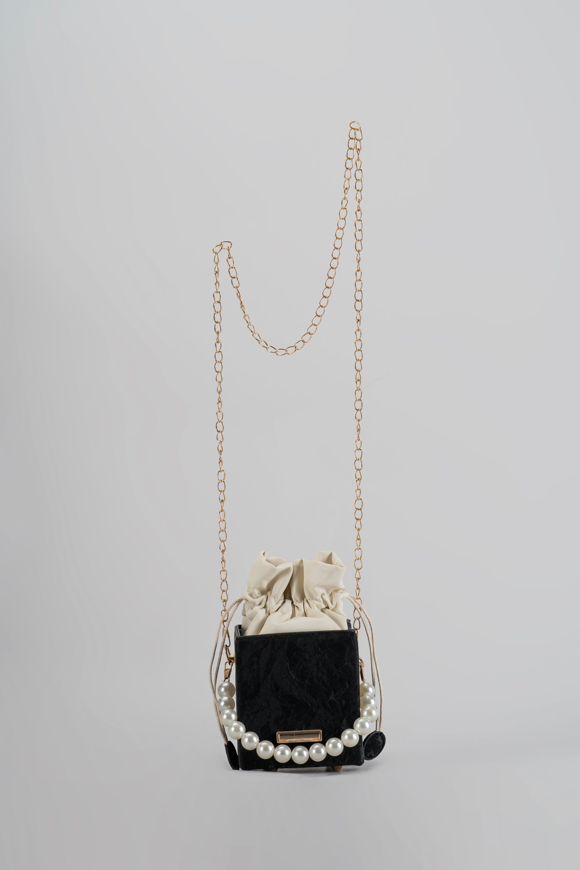 A decorative, small drawstring bucket bag. The main body is quilted black, topped with a white gathered fabric drawstring closure, and accented with an elegant faux pearl strand detail. Available in black and white.