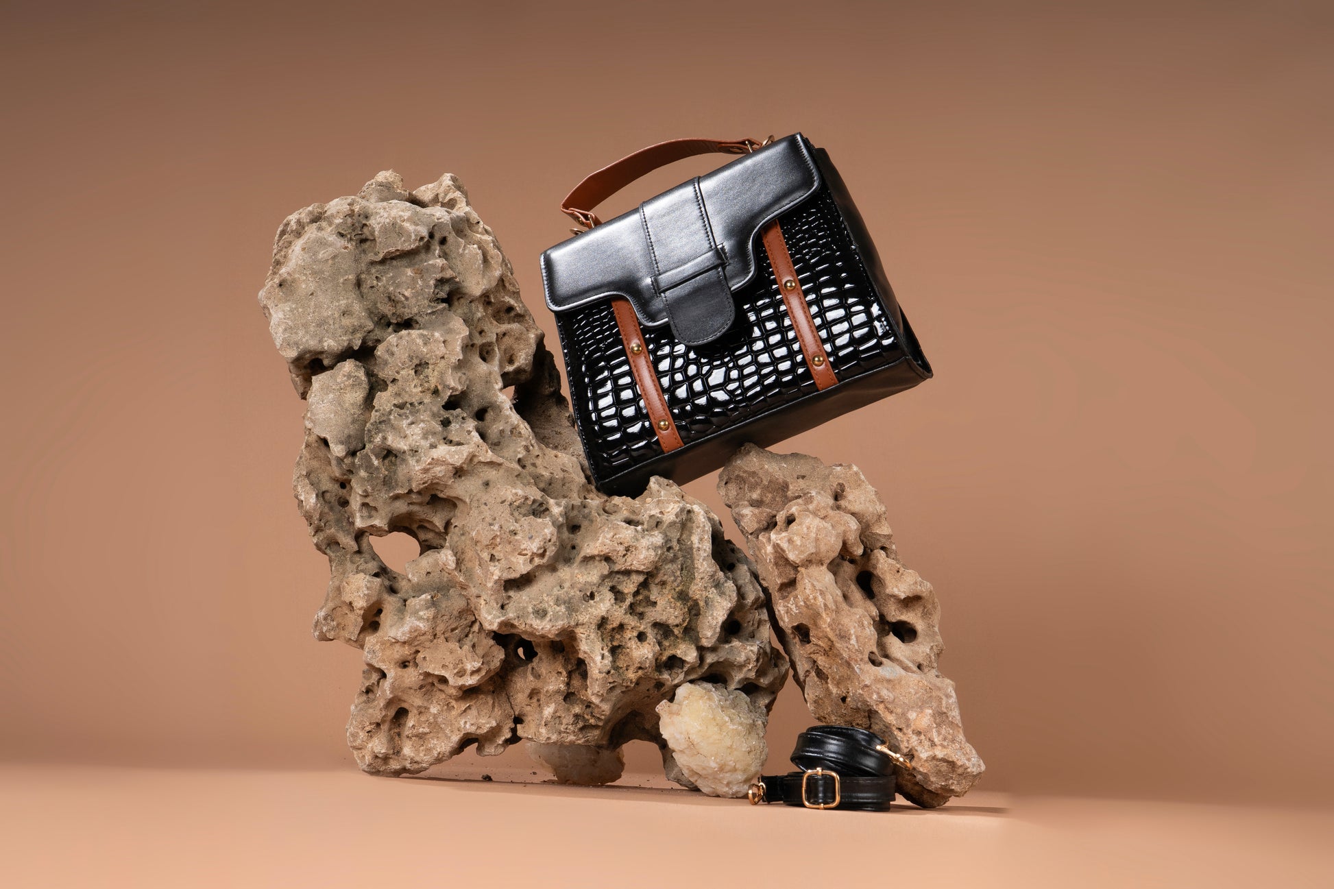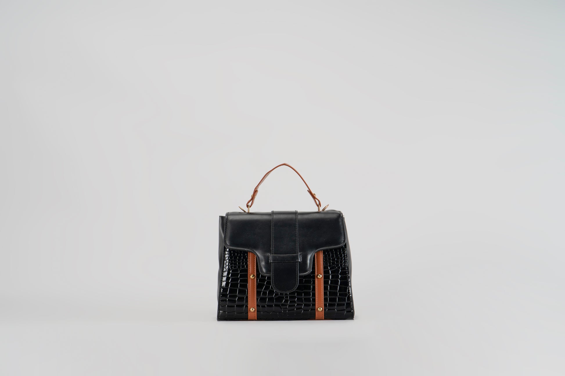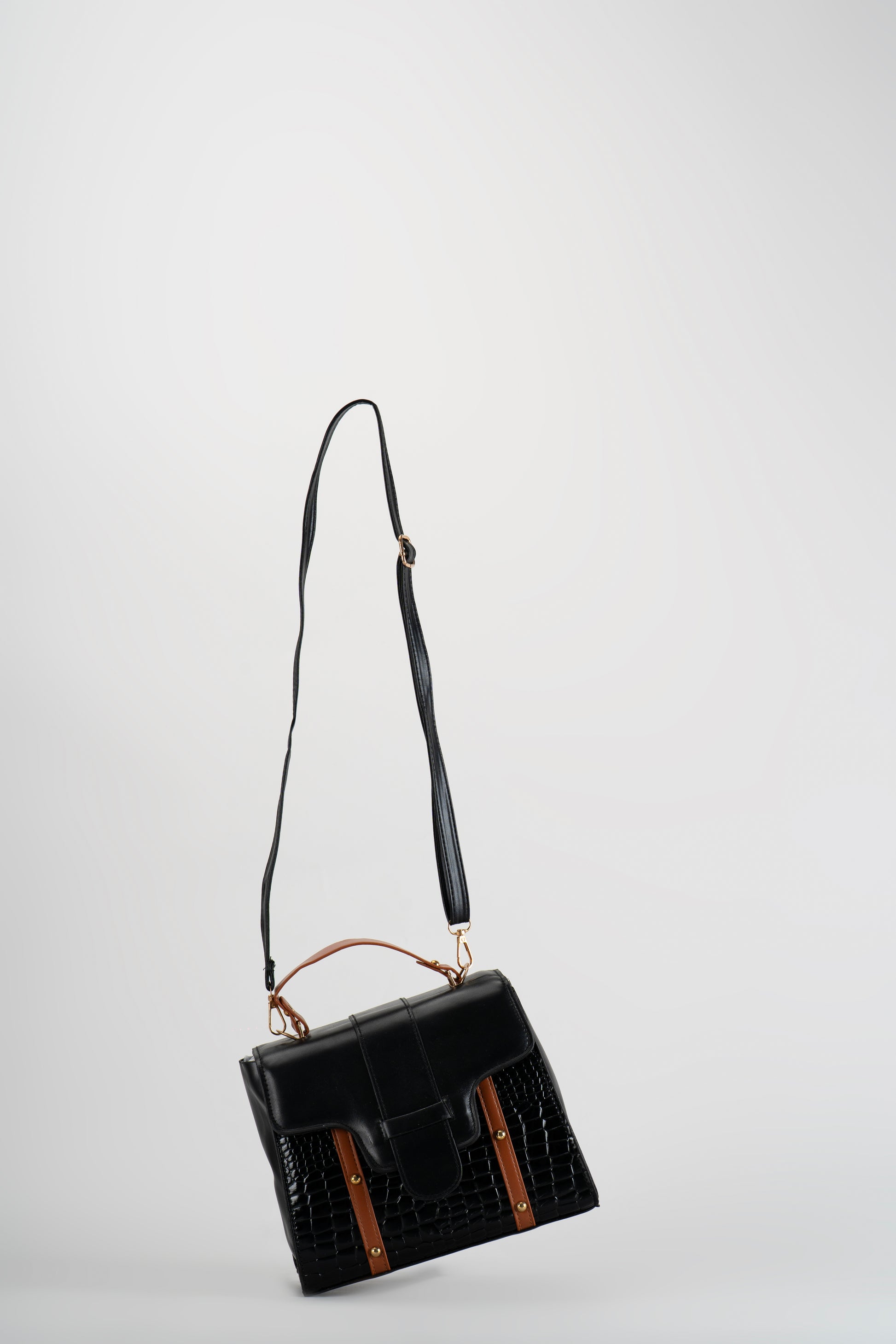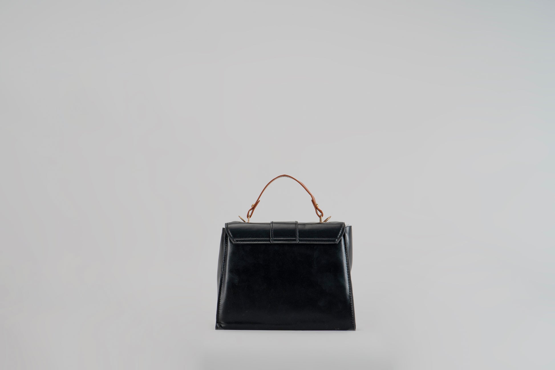 A structured flap bag with a small top handle. The body combines black with a dark brown textured pane on the front flap.