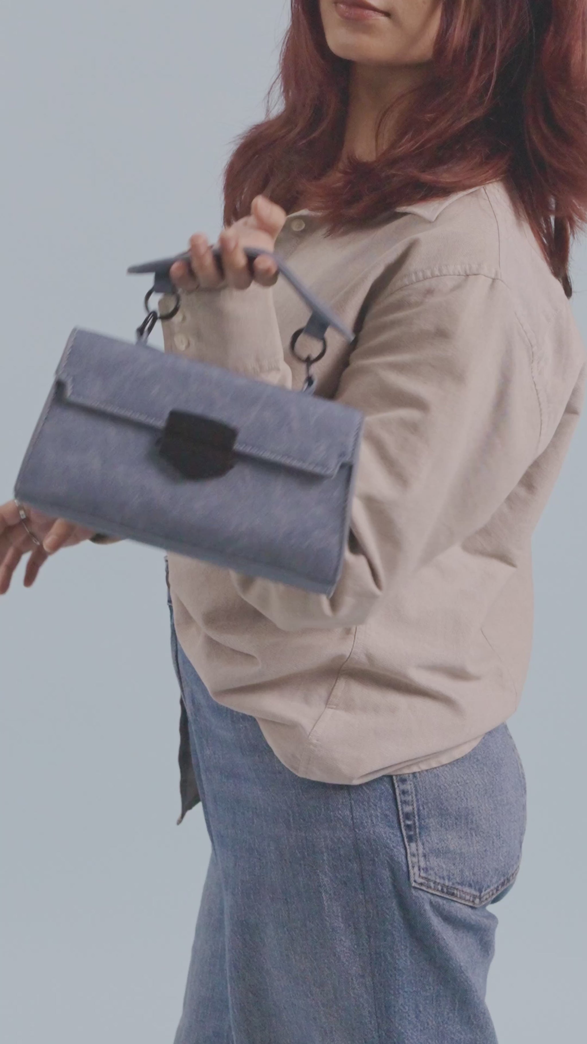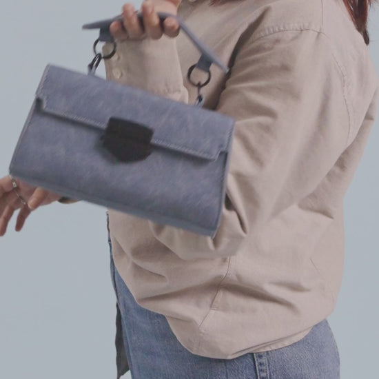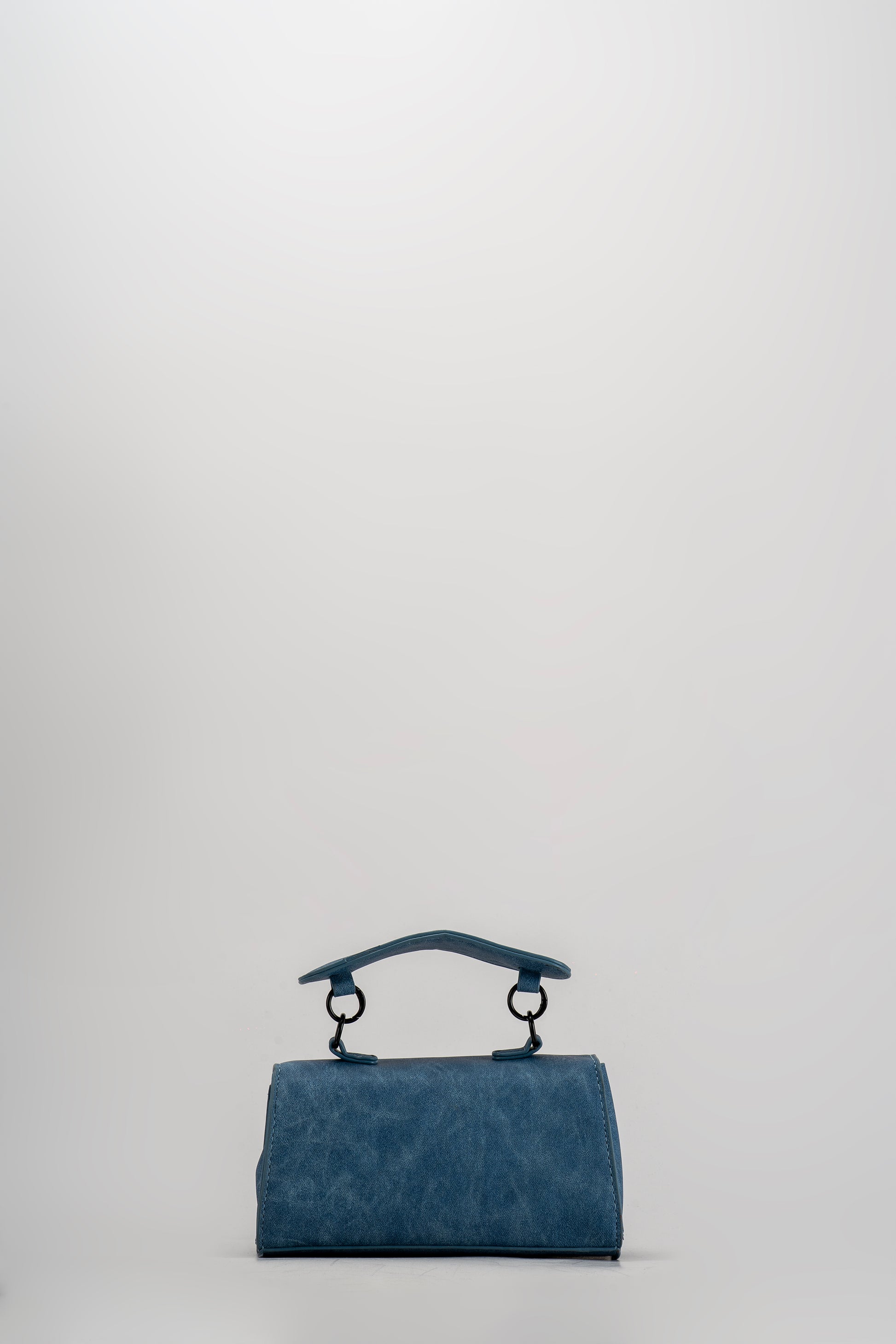 A structured mini-satchel with a top handle, shown in a textured blue fabric (resembling denim or suede). It has clean lines, a secure flap closure, and a wide sling strap attachment