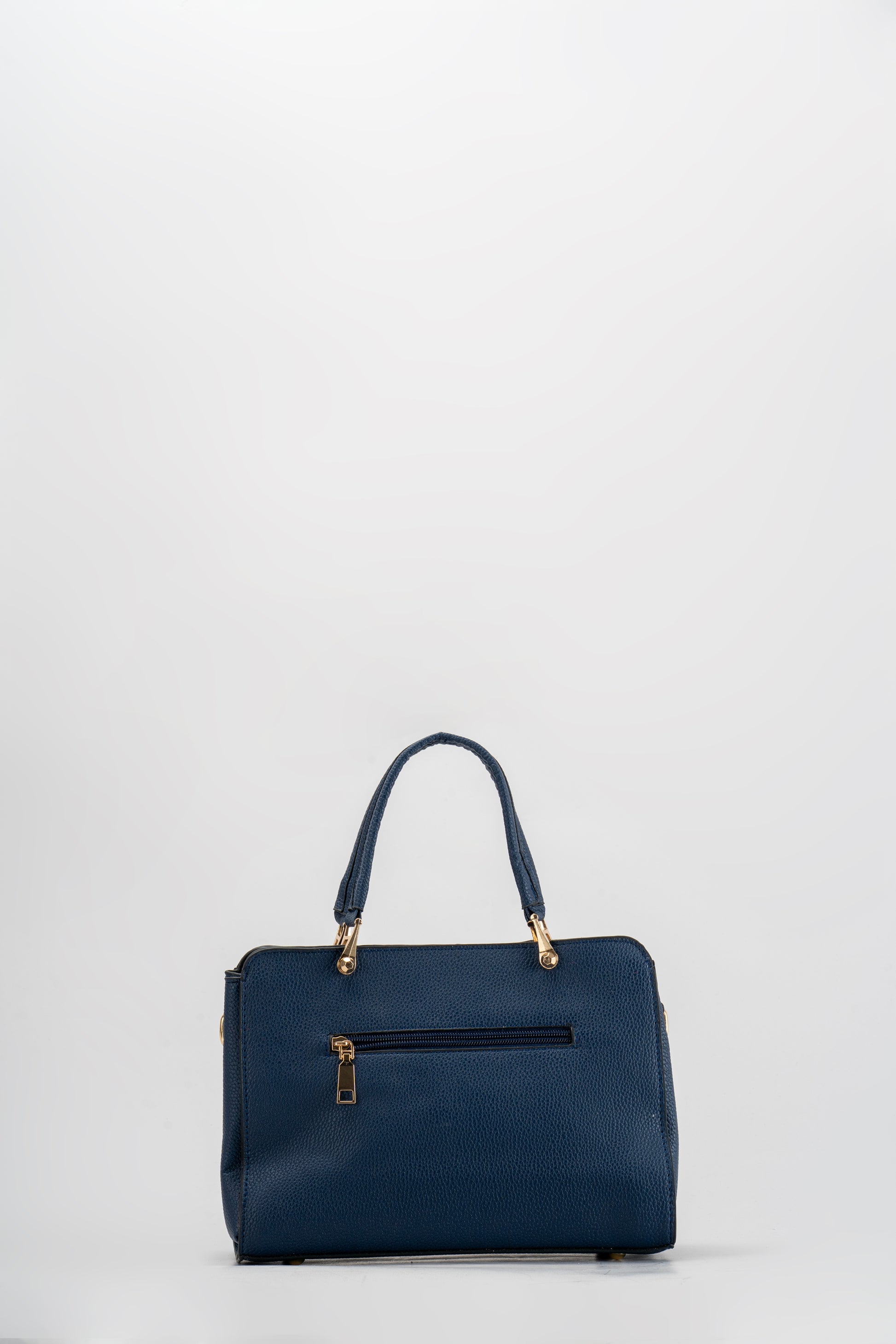 A functional, rectangular color-block tote style bag, primarily in navy blue and white. It has a structured shape, two top handles, and often includes a playful tassel or charm accessory. This bag is shown with black and blue color options.
