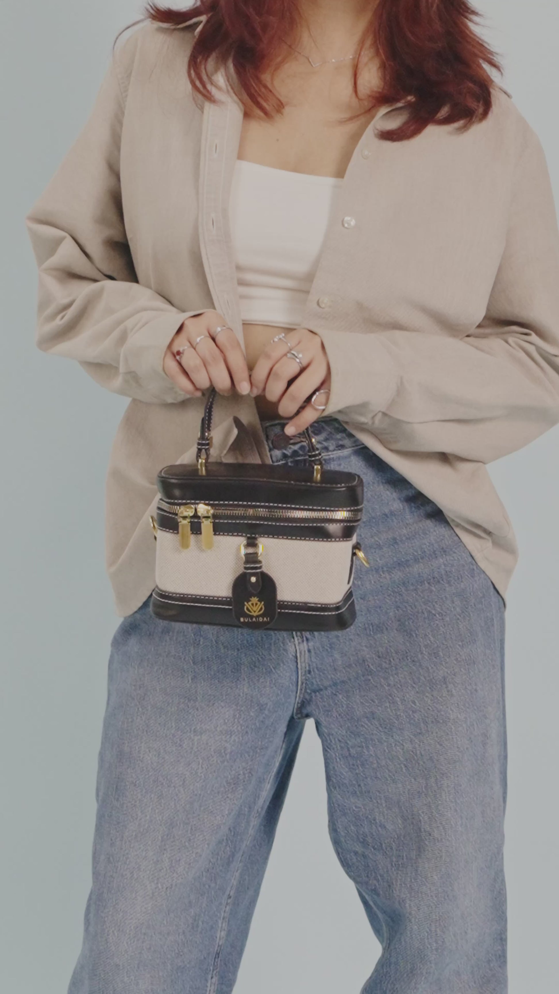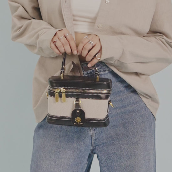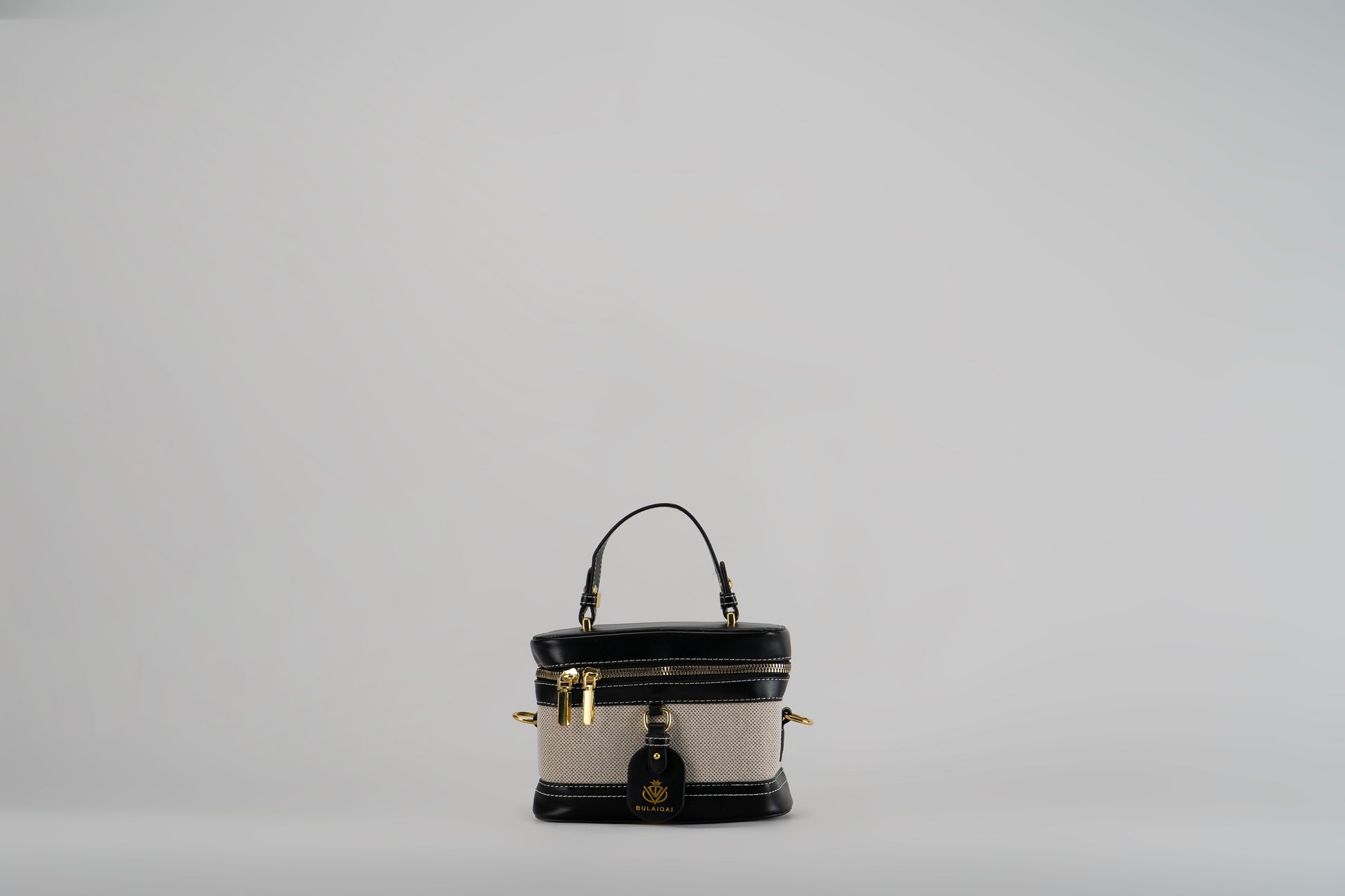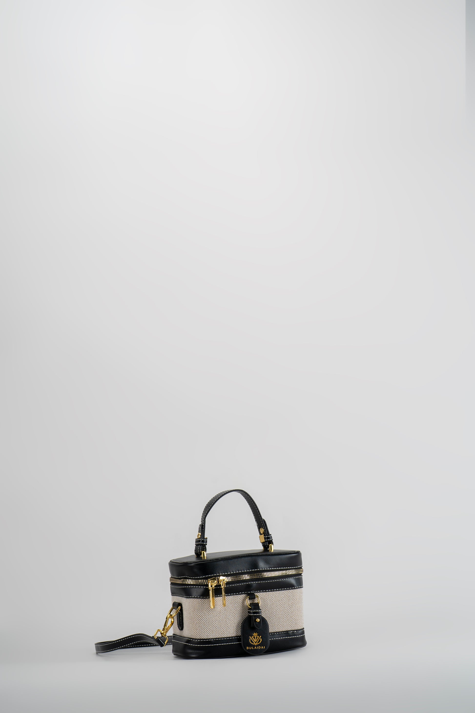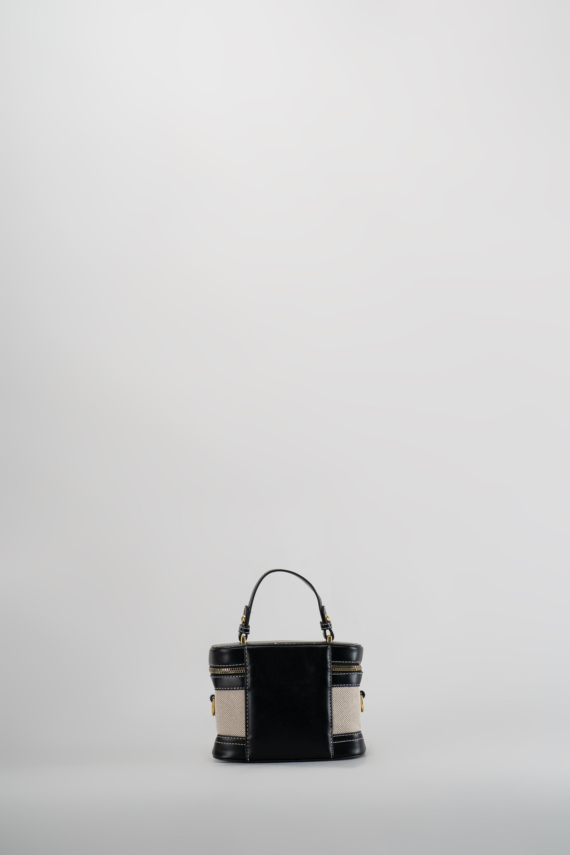 A compact, round "box" sling bag combining black and beige canvas/fabric. It features a sturdy top handle and metallic zipper detailing wrapping around the circular body.