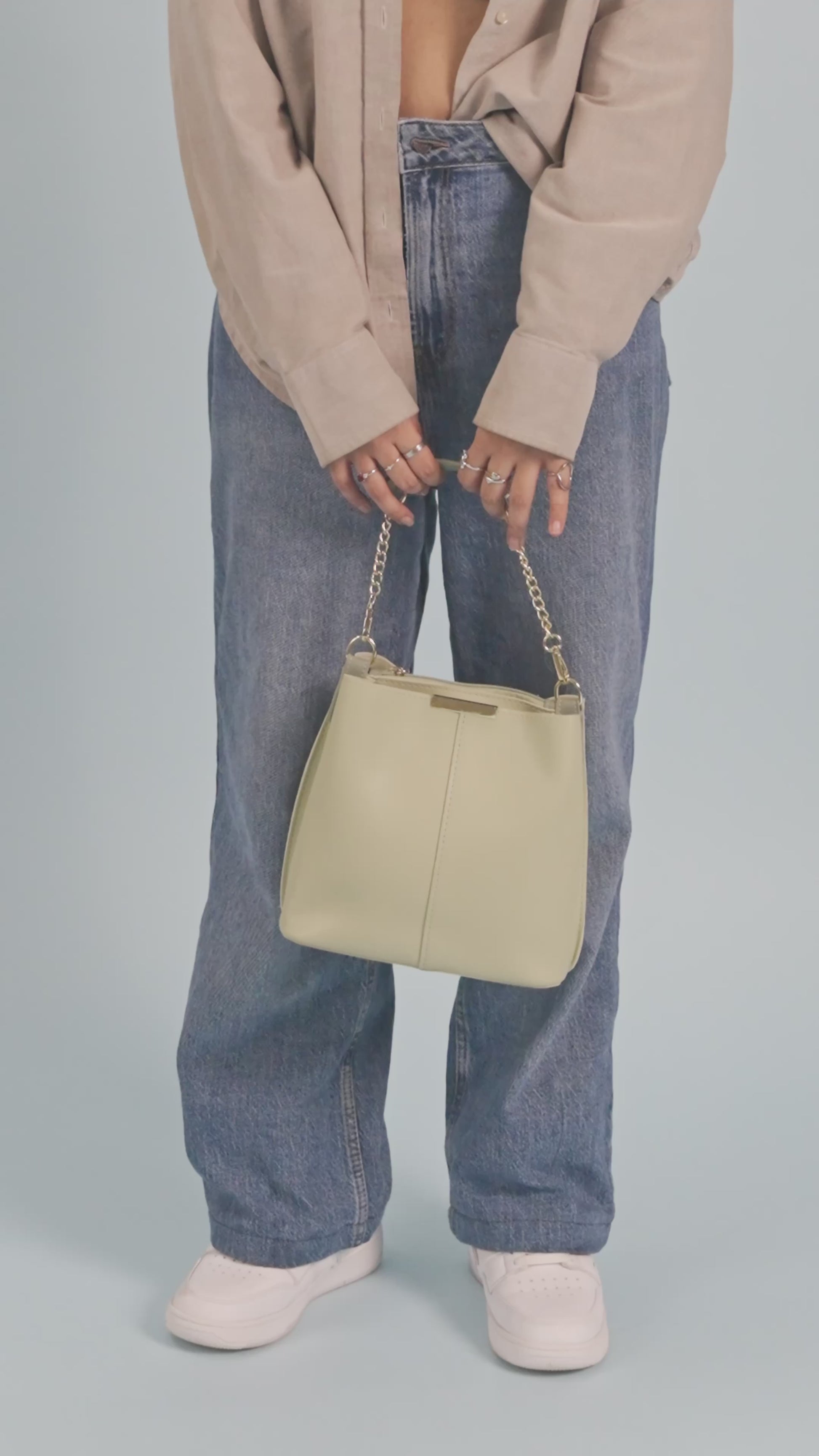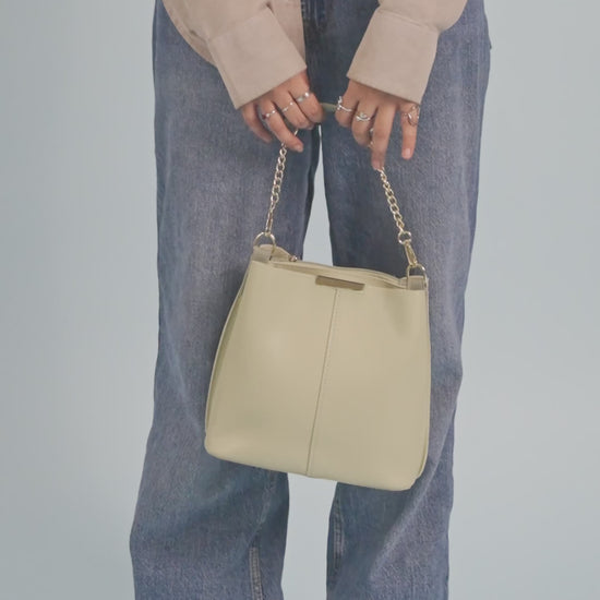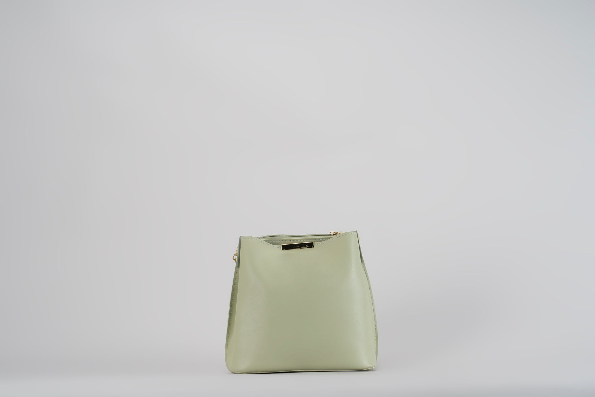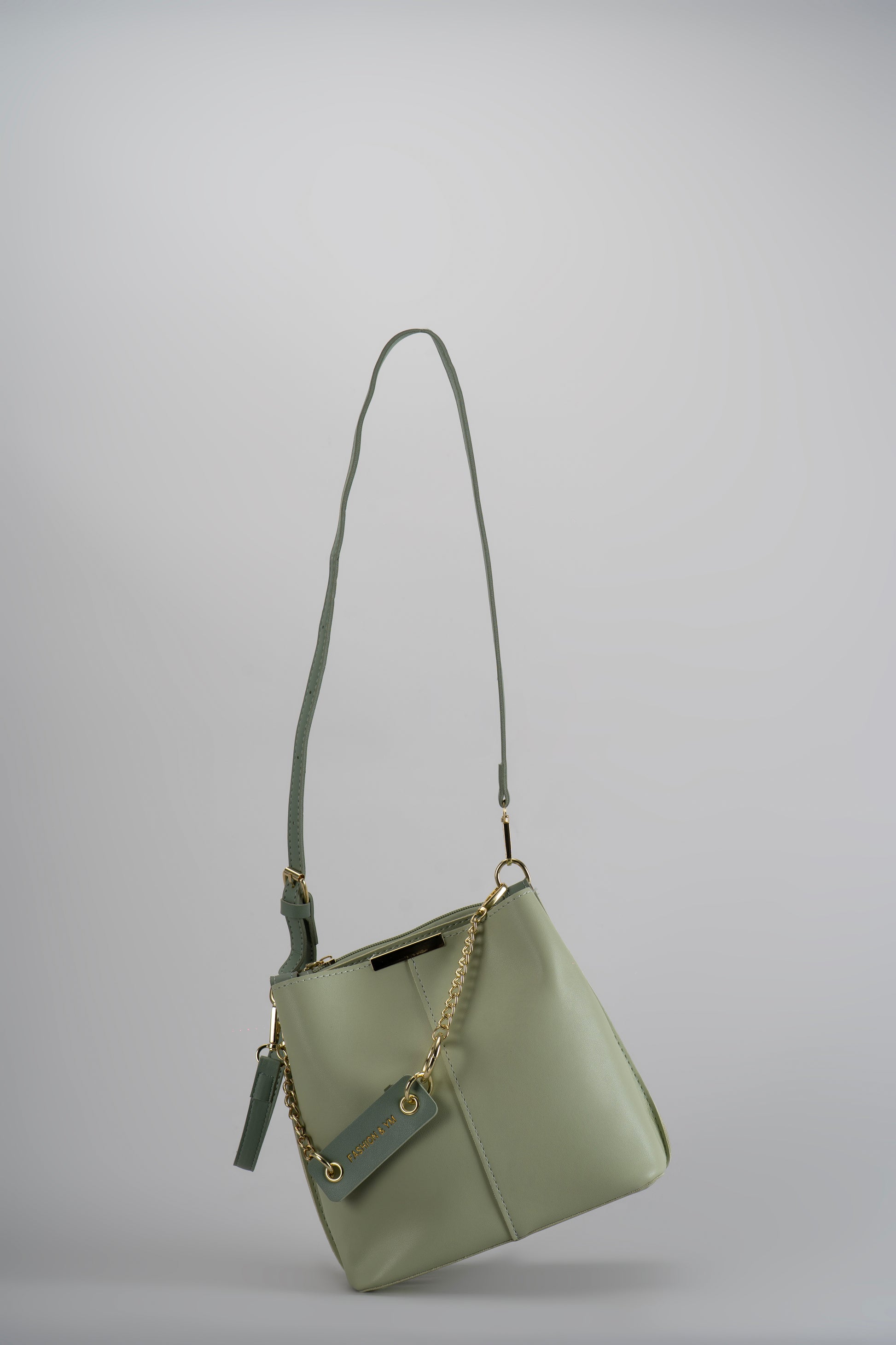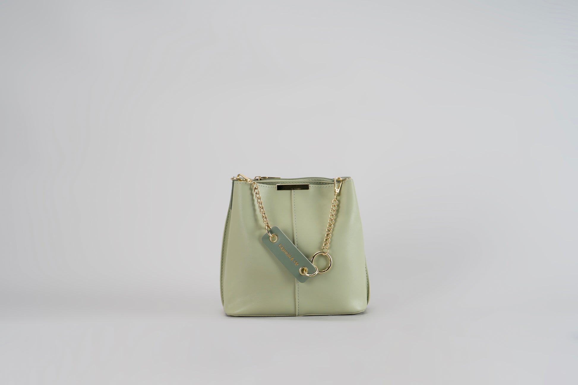 A light green bucket-style bag with a drawstring closure. It is characterized by its bold gold-tone circular hardware pieces on the strap attachment points. Available in green, black, and white.