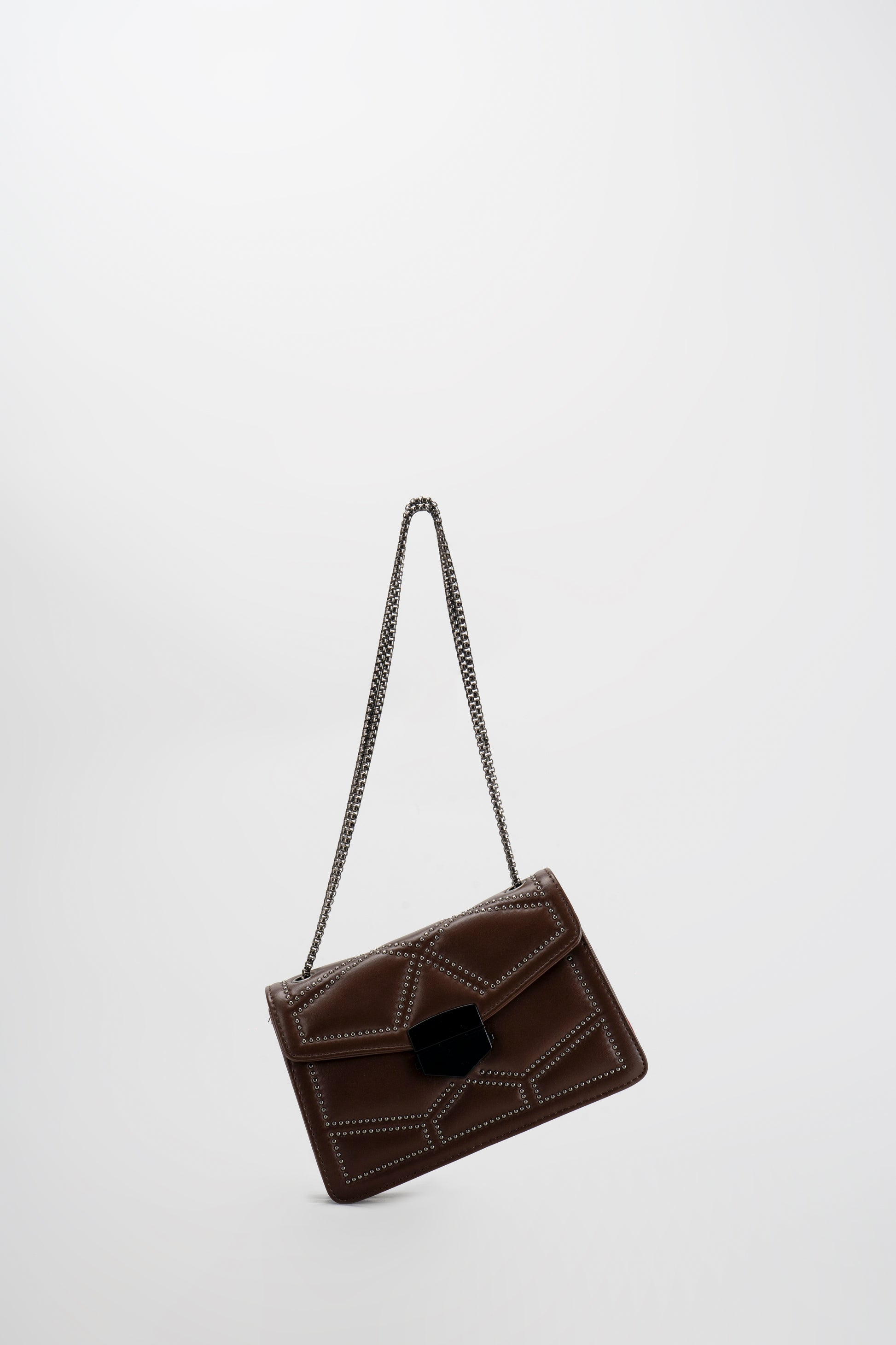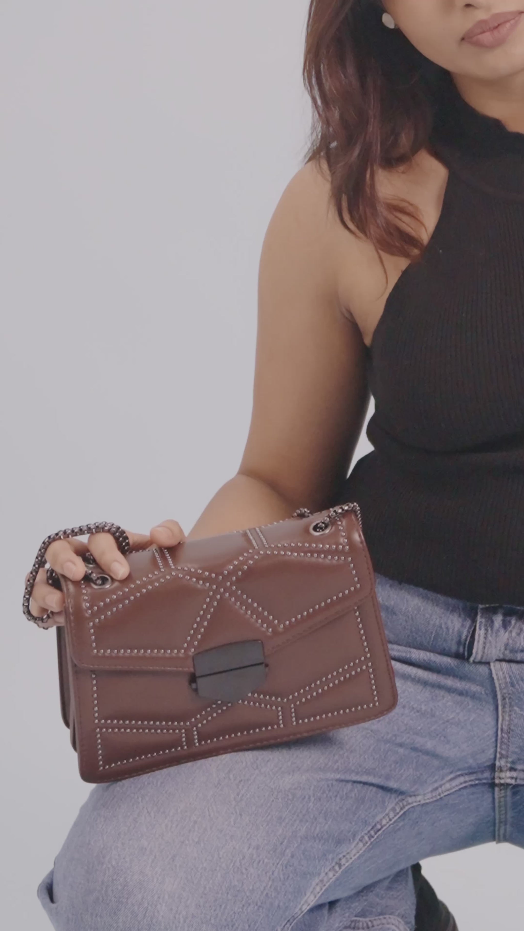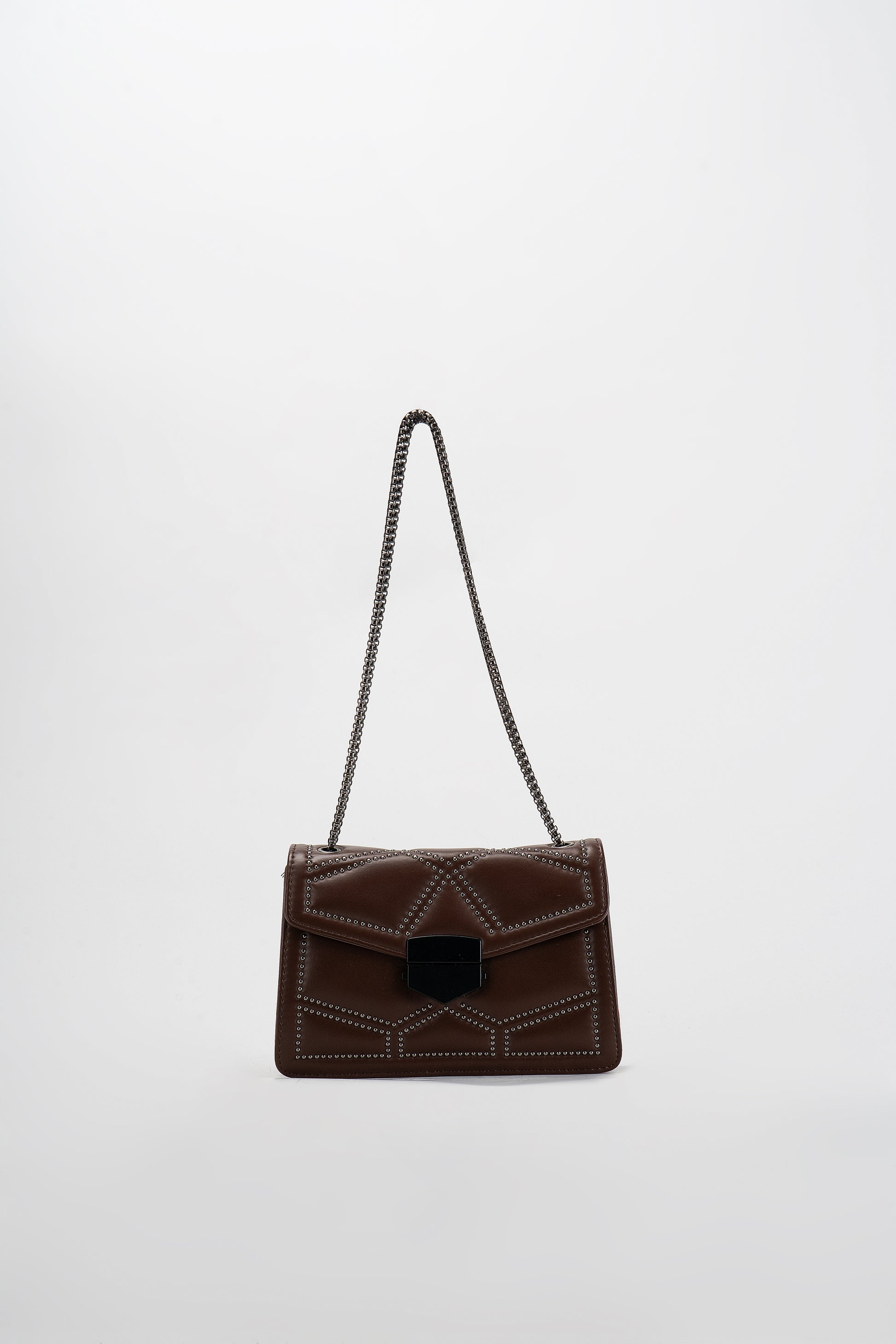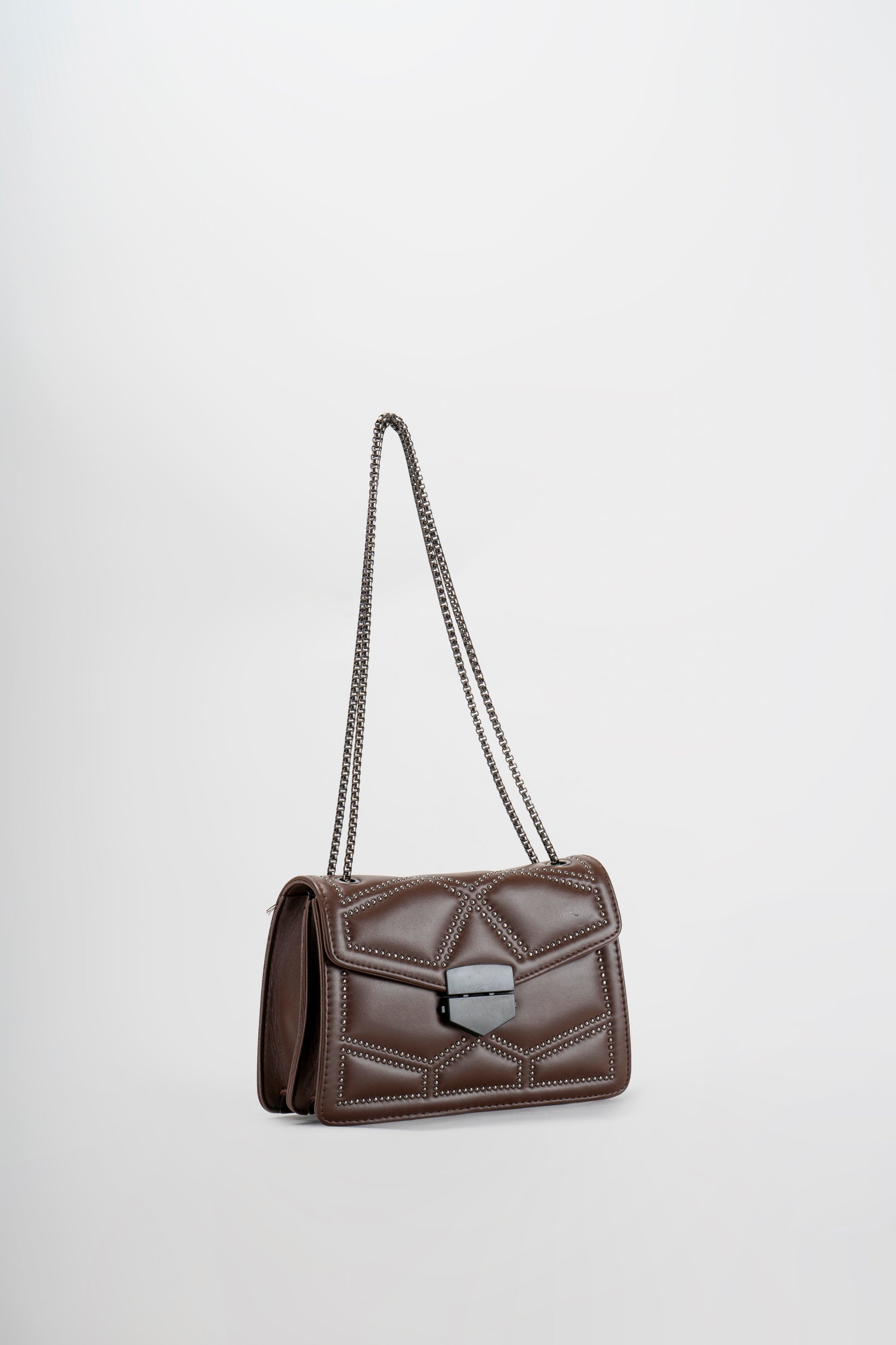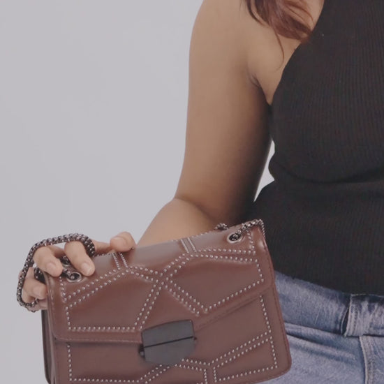 A dark brown small flap bag, featuring visible contrast stitching along the edges and a unique, deep quilted texture on the body. It includes a stylish chain sling strap.