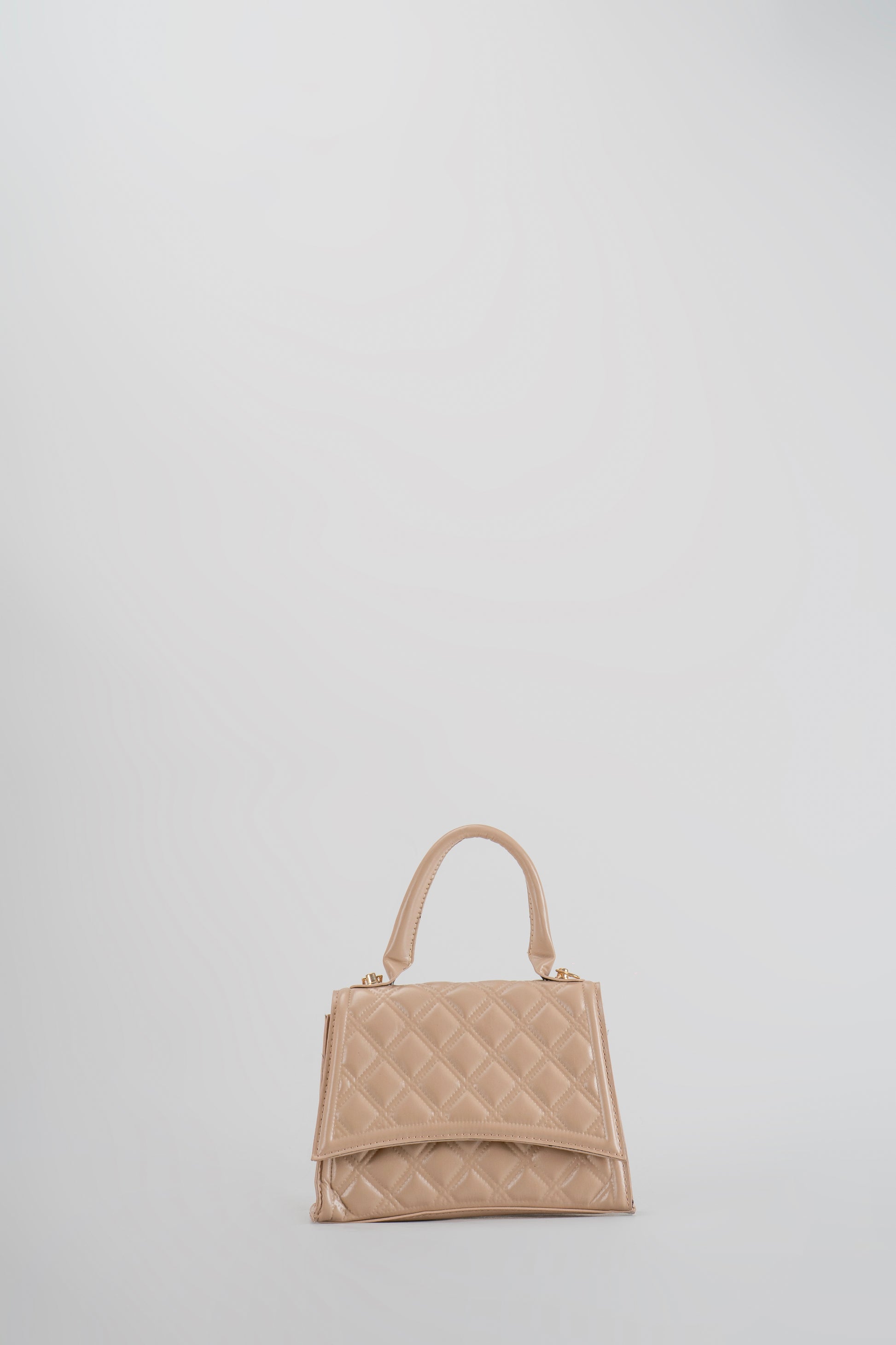 A stylish, compact top-handle bag in a light nude or blush pink tone. It features an overall quilted diamond pattern and a single structured top handle, offering a classic and sophisticated aesthetic.